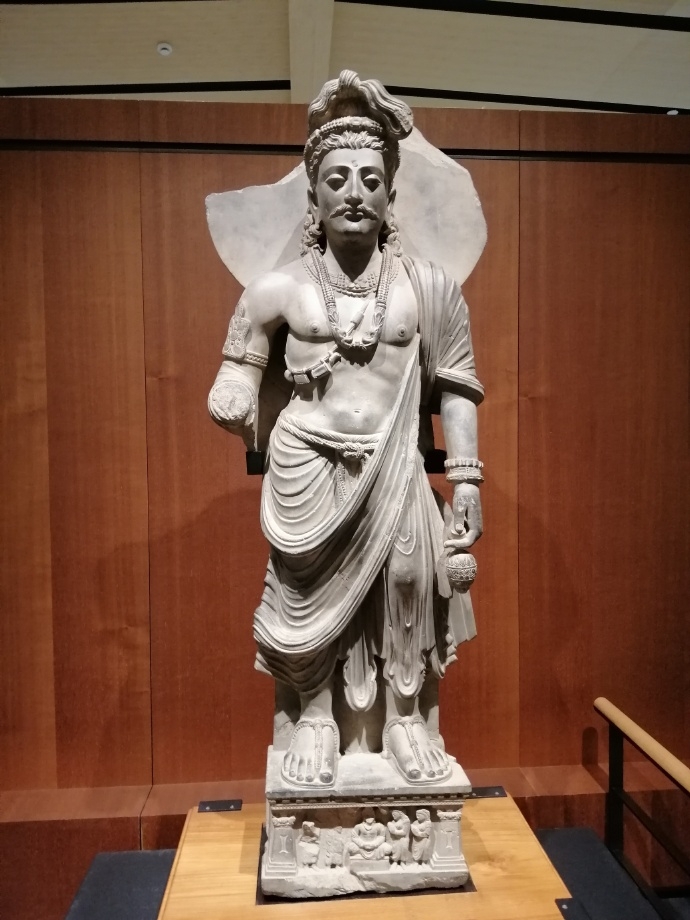 本次展览最大的塑像,弥勒菩萨立像。此像大约有一人高,头部经过修复。佛教信仰中,弥勒是未来世界的教主。也有研究说,弥勒来源于中东的救世主信仰,即《旧约》中的“弥赛亚”。当时犍陀罗地区的弥勒信仰十分兴盛。束发前垂是弥勒的典型标志,身材比例不太健美,但身体重心是典型的希腊式S形,右边突出的髋部,以及微屈的左膝,形成一种前行的动态效果。