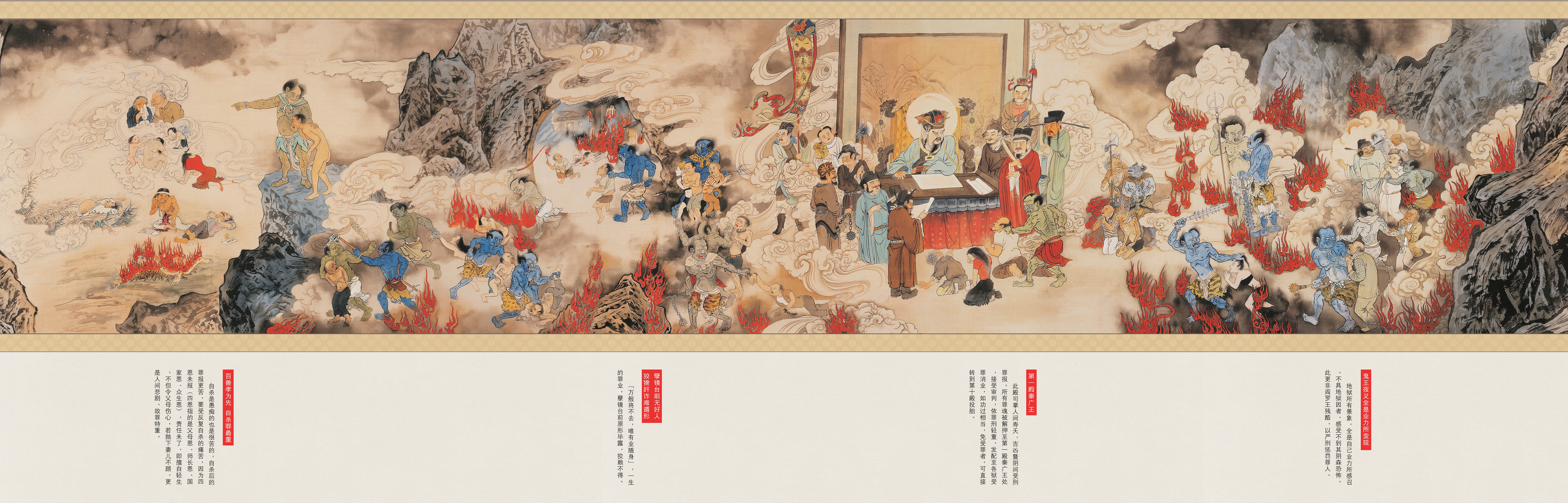 《地狱变相图》就是介绍人堕地狱受种种罪报之真相,同时也说明地狱果报全是自作自受,不是阎罗天子所定的罪。故我们深深期望浏览本图之后,能唤醒大家明白得人身之可贵,起心动念造作罪业堕地狱之可怕。故经云:真诚发露忏悔,即可远离罪报,愿我们一起共勉之。