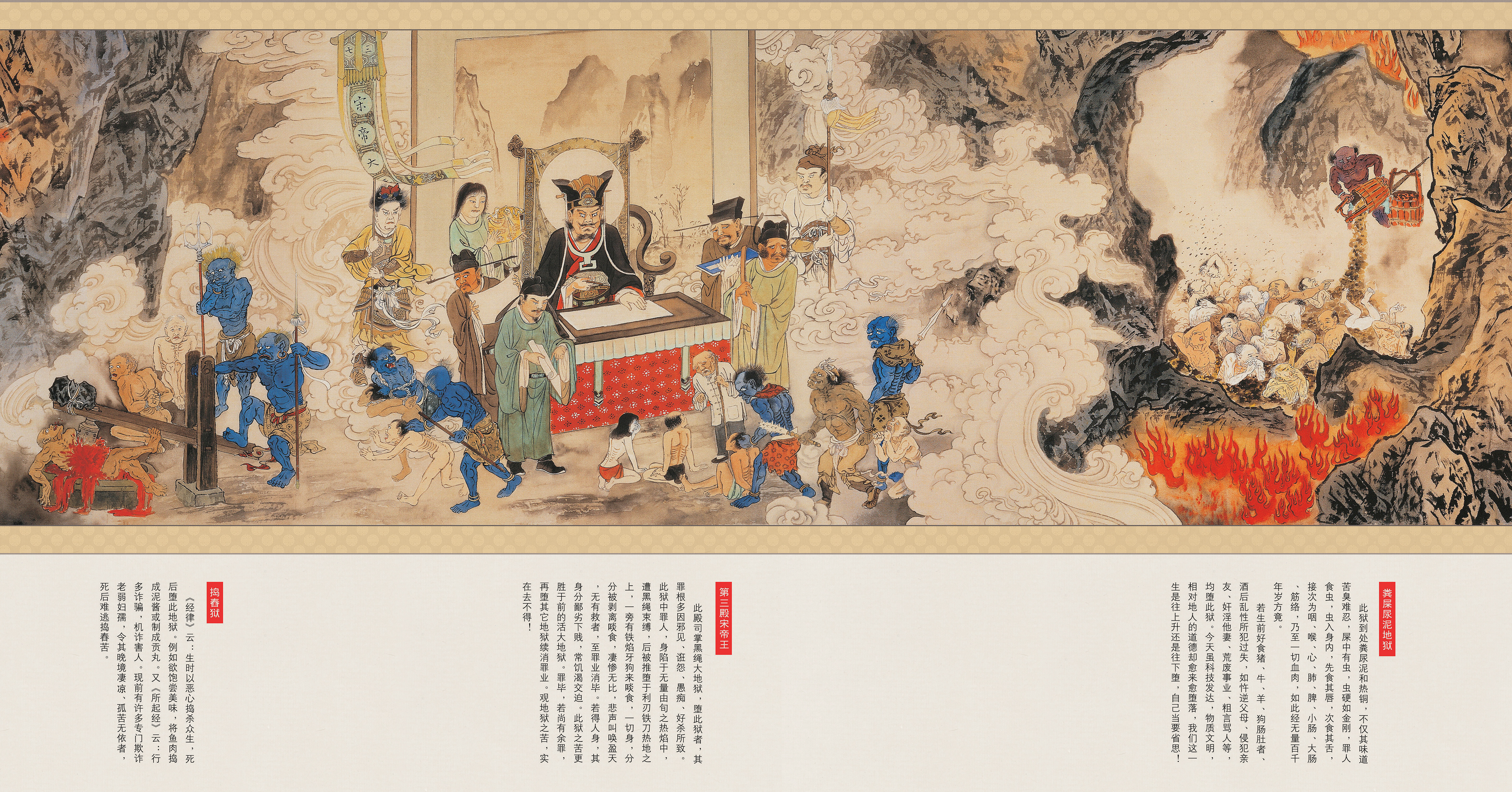 《地狱变相图》就是介绍人堕地狱受种种罪报之真相,同时也说明地狱果报全是自作自受,不是阎罗天子所定的罪。故我们深深期望浏览本图之后,能唤醒大家明白得人身之可贵,起心动念造作罪业堕地狱之可怕。故经云:真诚发露忏悔,即可远离罪报,愿我们一起共勉之。