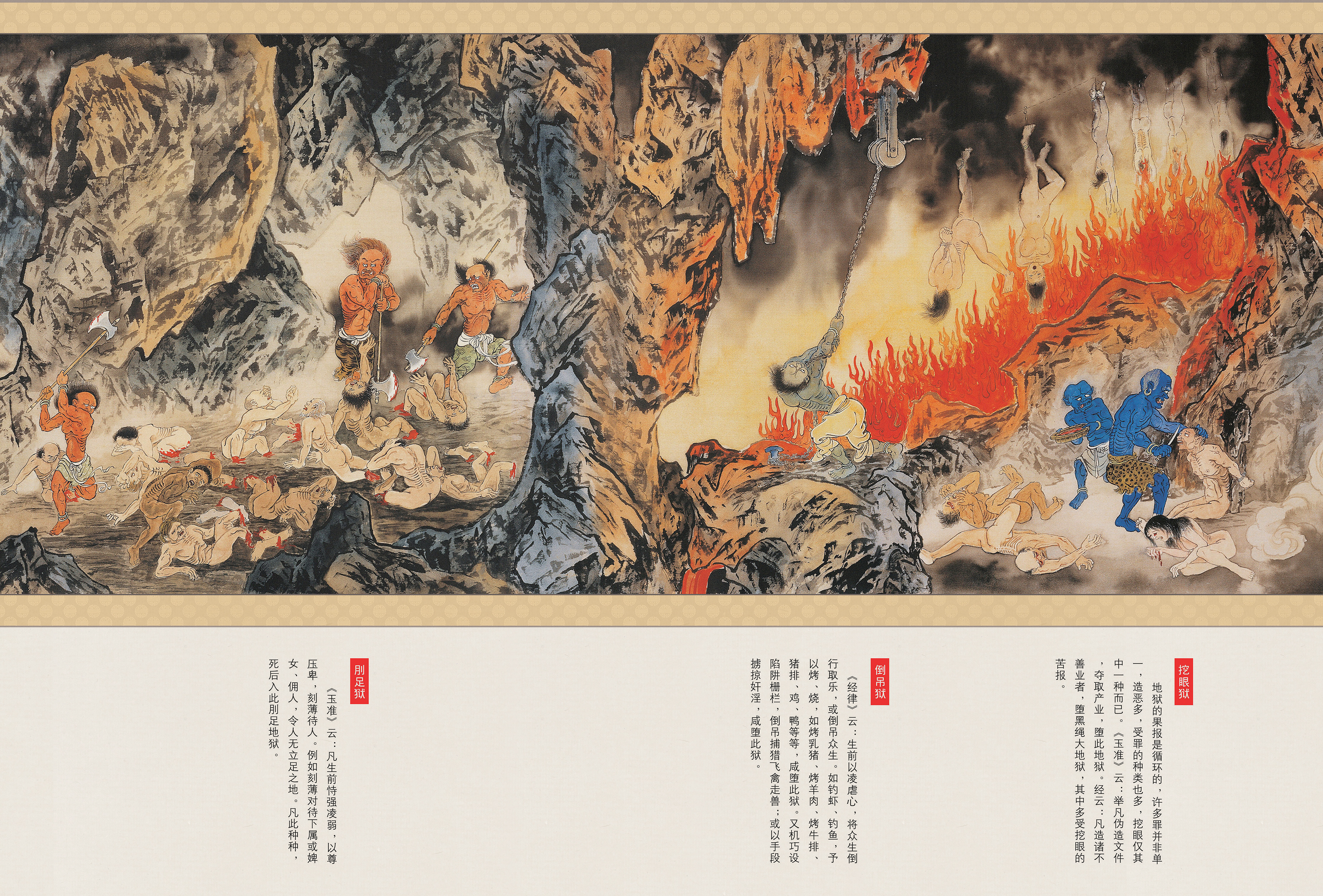 《地狱变相图》就是介绍人堕地狱受种种罪报之真相,同时也说明地狱果报全是自作自受,不是阎罗天子所定的罪。故我们深深期望浏览本图之后,能唤醒大家明白得人身之可贵,起心动念造作罪业堕地狱之可怕。故经云:真诚发露忏悔,即可远离罪报,愿我们一起共勉之。