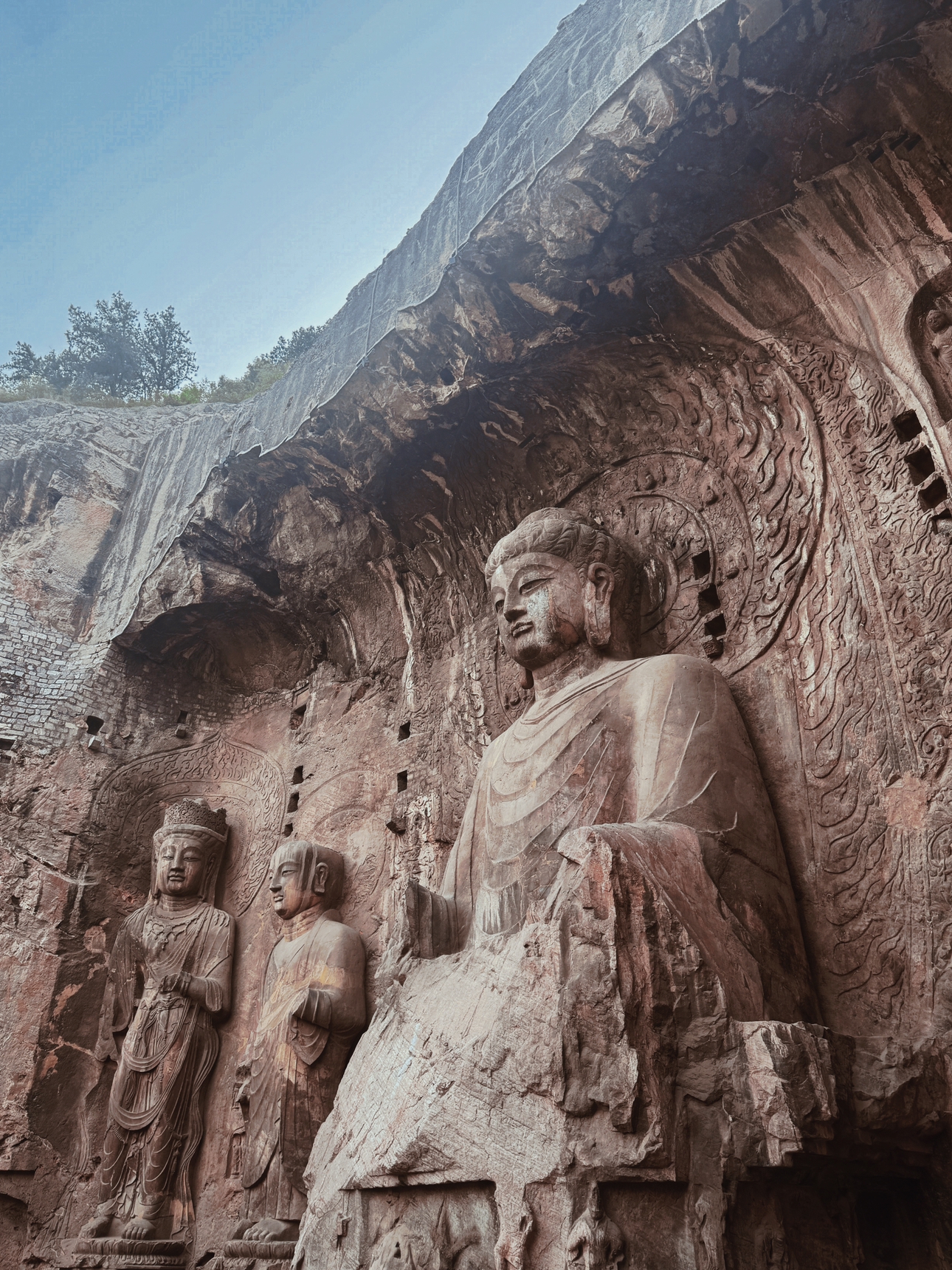 卢舍那大佛,佛高17.14米,头高4米,耳长1.90米,位居佛龛中央,丰颐秀目,嘴角略翘,稍含笑意,微微俯视的双眼恰同信徒们仰视的目光交会,形象既庄严雄伟又不失睿智慈祥。她是唐人心中美与智慧的化身,也是中国现存最完美、最知名的佛教造像之一,她不仅是当今龙门石窟最具标志性的作品,同时更是中国唐代佛教雕刻艺术的代表作。卢舍那佛是报身佛的名字,也是对佛真身的尊称。大佛通高十七米多,仅耳朵就有一米九。在佛经中,卢舍那是佛在显示美德时的一种理想化身。