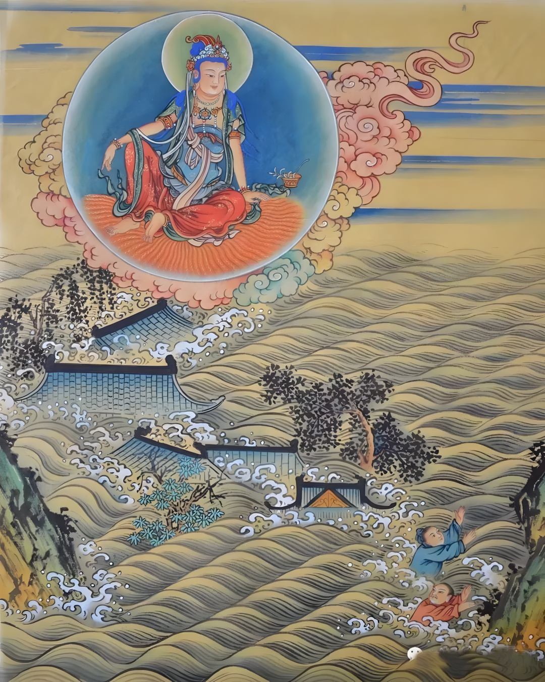 【释义:或是漂没大海里,遭遇龙鱼诸鬼难,心念观音威神力,不被波浪所吞没。】
