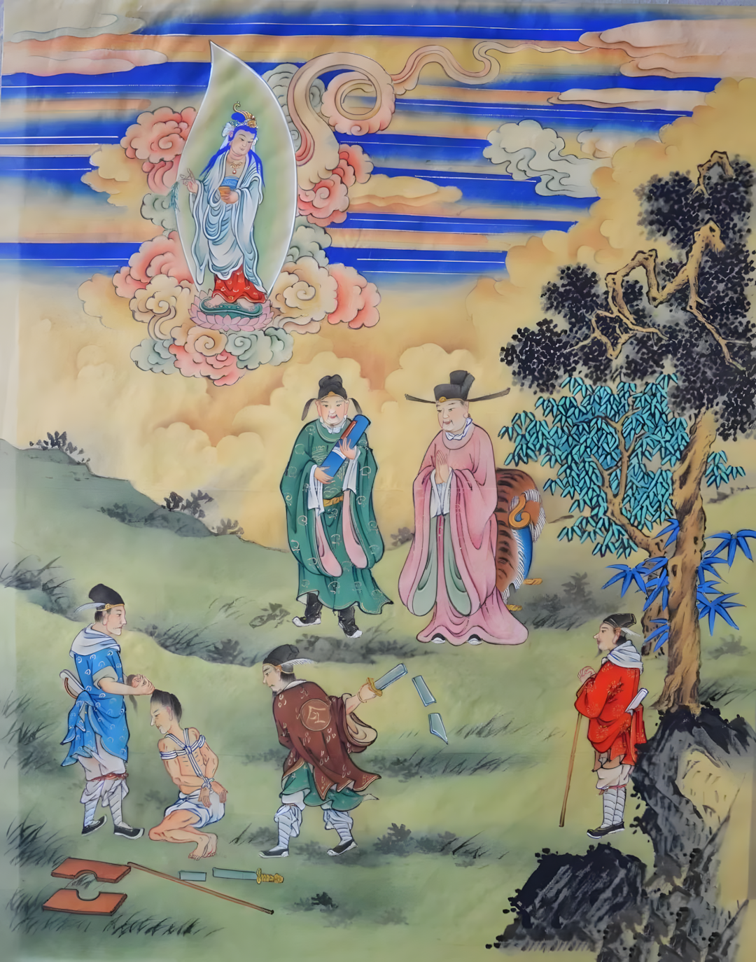 【释义:或犯王法受苦难,绑赴刑场命将终;心念观音威神力,刀斧即便段段坏。】