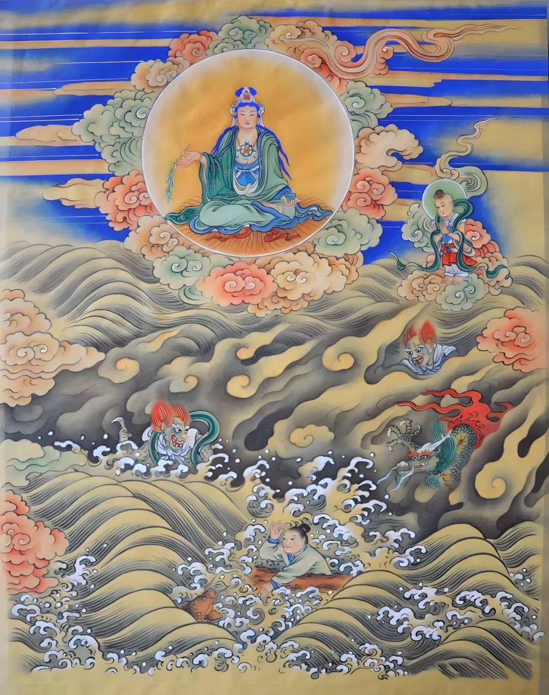 【释义:或是漂没大海里,遭遇龙鱼诸鬼难,心念观音威神力,不被波浪所吞没。】