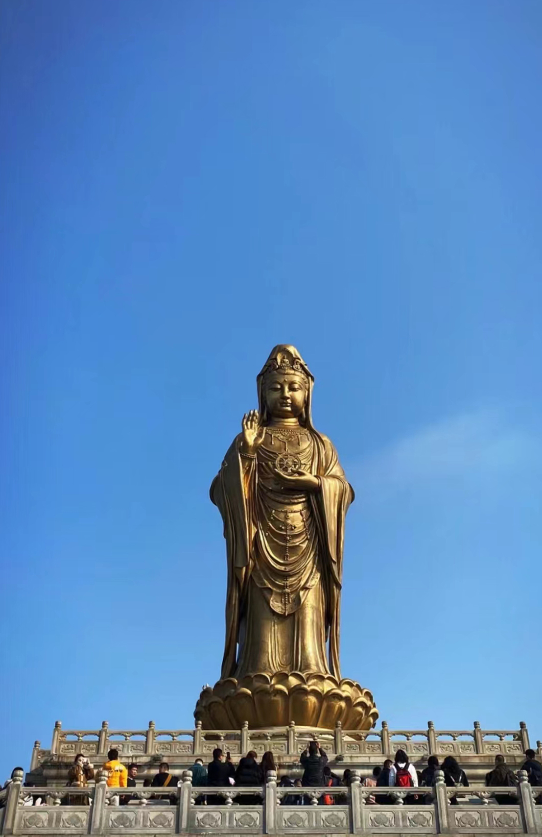 观音铜像、净高20米,莲座高2米,底座双层大厅,与铜像合一,总高33米。像身采用96块优质仿金铜焊接而成,重70余吨;铜像端庄,面如满月,左手捧法轮,右手结施无畏印,金光闪烁、高入云霄。莲座下为两层方形殿堂,外墙用灰白色细磨花岗岩包饰,正面和两侧紫铜拱门精雕各色花卉图案。像前礼佛广场三面围以灰白色细磨花岗岩栏杆,广场前台基两重,雕栏玉砌,气势宏伟。