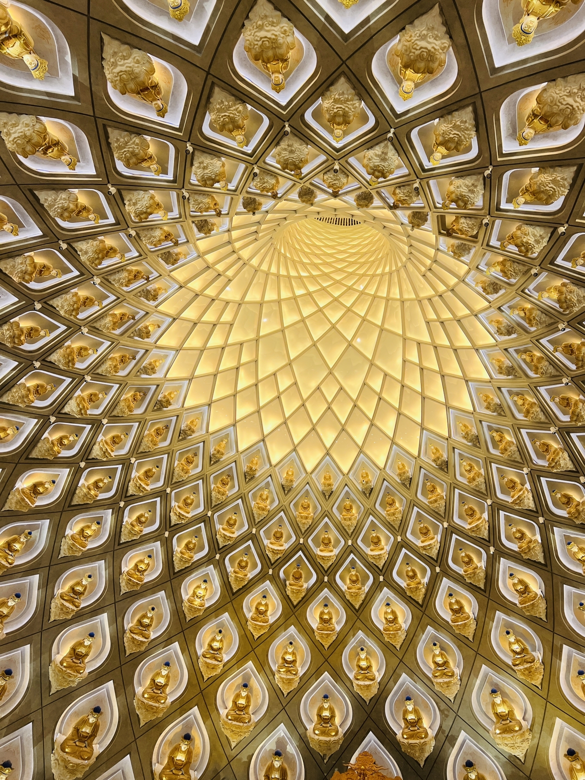 (1层圆通大殿内供奉着一座桧木木雕千手观音,雕刻得极为精美,巨大的莲花台上,罗汉和仙人们围绕着千手观音,穹顶上有整整三百一十座毗卢观音的正(法)身像。)