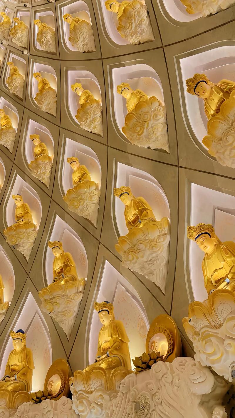 (1层圆通大殿内供奉着一座桧木木雕千手观音,雕刻得极为精美,巨大的莲花台上,罗汉和仙人们围绕着千手观音,穹顶上有整整三百一十座毗卢观音的正(法)身像。)