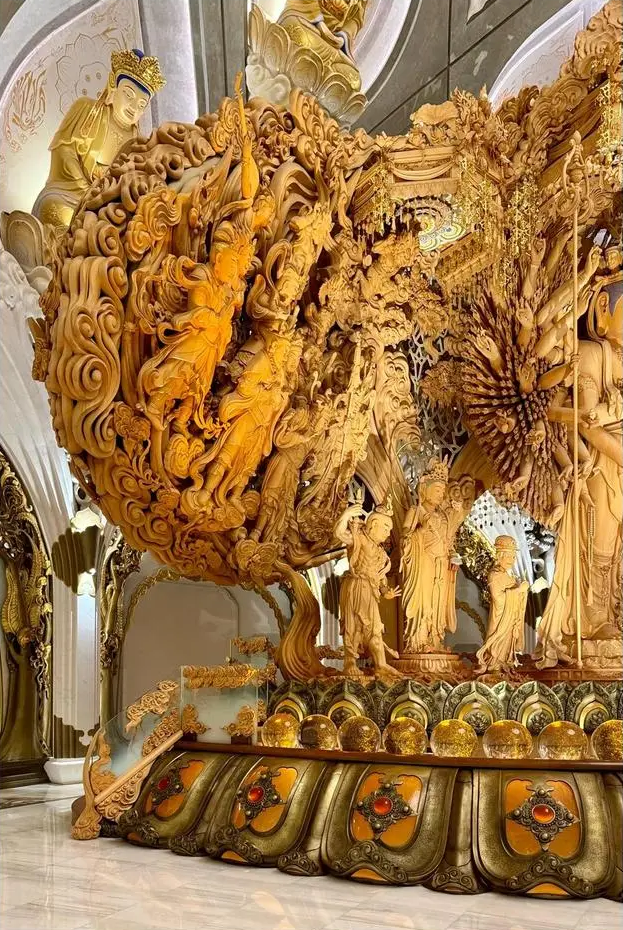 (1层圆通大殿内供奉着一座桧木木雕千手观音,雕刻得极为精美,巨大的莲花台上,罗汉和仙人们围绕着千手观音,穹顶上有整整三百一十座毗卢观音的正(法)身像。)