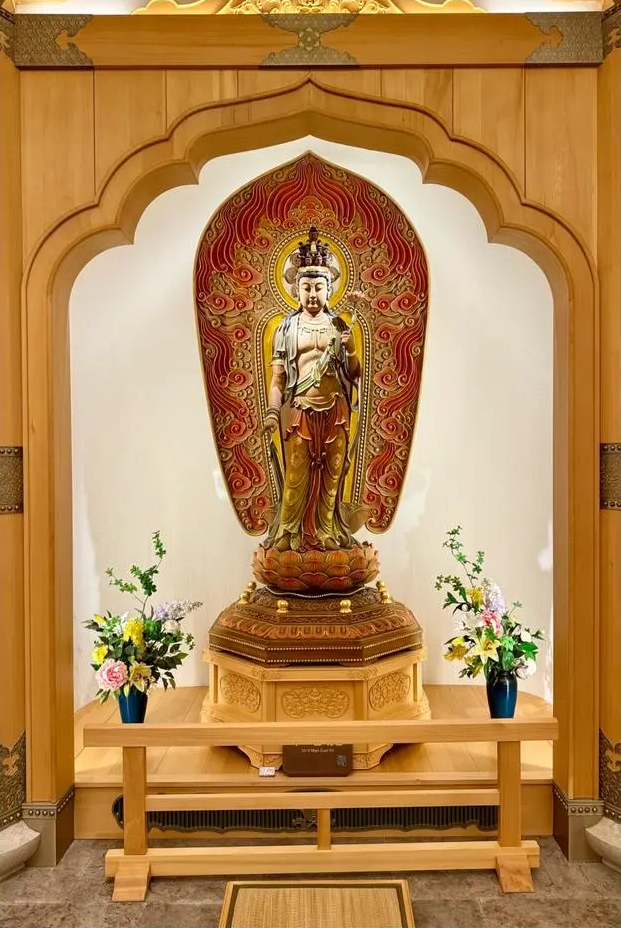 (1层圆通大殿内供奉着一座桧木木雕千手观音,雕刻得极为精美,巨大的莲花台上,罗汉和仙人们围绕着千手观音,穹顶上有整整三百一十座毗卢观音的正(法)身像。)