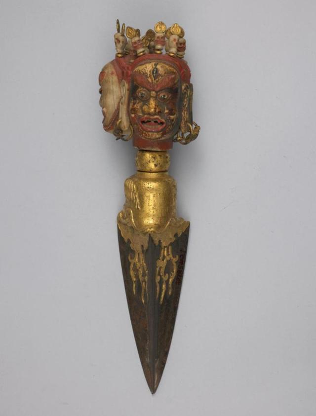金刚橛,梵文译为vajvakilaka,音译为“伐迦罗羯罗迦”又称四方橛,和金刚杵一样在古印度时期是当做武器使用的。后融入古印度佛教流传到西藏。金刚橛的型制和匕首差不多,尖刃头加握柄。但与匕首的区别是金刚橛普遍握柄较长刃头较短。