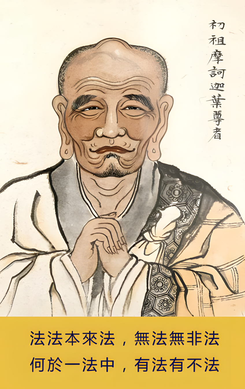 释迦文佛首传摩诃迦叶尊者,第二、阿难尊者,第三、商那和修尊者,第四、优波鞠多尊者,第五、提多迦尊者,第六、弥遮迦尊者,第七、婆须蜜多尊者,第八、佛驮难提尊者,第九、伏驮蜜多尊者,第十、胁尊者,第十一、富那夜奢尊者,第十二、马鸣大士,第十三、迦毗摩罗尊者,第十四、龙树大士,第十五、迦那提婆尊者,第十六、罗睺罗多尊者,第十七、僧伽难提尊者,第十八、伽耶舍多尊者,第十九、鸠摩罗多尊者,第二十、阇耶多尊者,第二十一、婆修盘头尊者,第二十二、摩拏罗尊者,第二十三、鹤勒那尊者,第二十四、师子尊者,第二十五、婆舍斯多尊者,第二十六、不如蜜多尊者,第二十七、般若多罗尊者,第二十八、菩提达摩尊者,第二十九、慧可大师,第三十、僧璨大师,第三十一、道信大师,第三十二、弘忍大师,惠能是为三十三祖