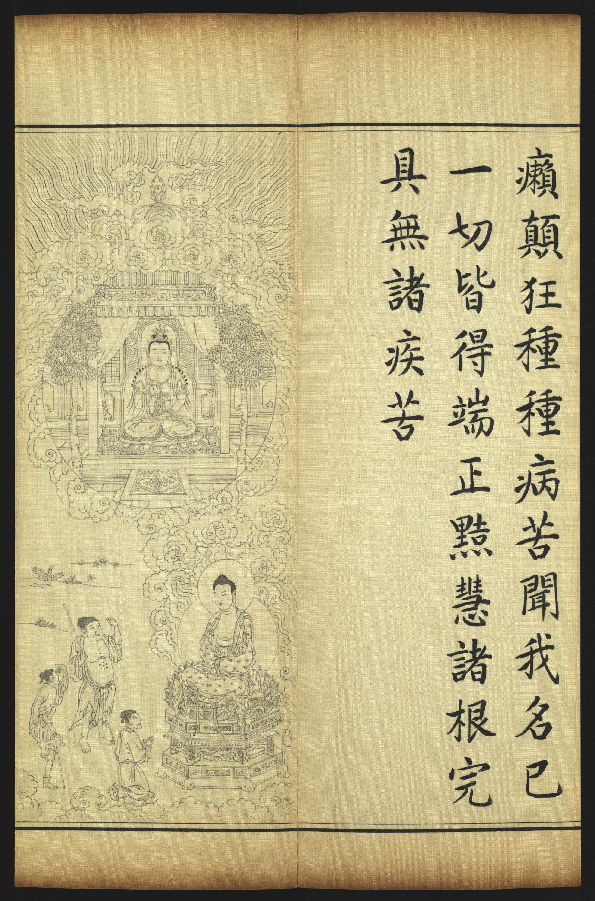 《药师瑠璃光如来本愿功德经》简称《药师经》,玄奘法师译,陈颂东方径琉璃世界药师如来的功德,并详述药师如来因地所发十二大愿。此经册黄地织金丝彩锦云龙纹书衣,正中泥金楷书“药师瑠璃光如来本愿功德经”。经折装,开本30.5 厘米×12.5 厘米,经文116 开,为素绢墨笔楷书,有行格,半开四行,行13 字。精美插图32 幅,经册开端绘刻“释迦佛”开示药师法门。释迦佛,成道相,结跏趺坐背光方形莲花座,左手横放在左脚上,名为“定印”,右手直伸下垂,名“触地印”,身后绘祥云、海水、伞、盖等“佛八宝”图样,“菩萨”、“天王”分供两旁。经册中部绘有日光、月光菩萨像与文殊、观音、大势至、无尽意、宝檀华、药王、药上、弥勒八大菩萨。经册后绘十二药叉大将与四大天王像,以药师佛像为中心分供两旁,尾绘有“韦陀像”。在经册第五开所绘製的承愿佛碑上,有楷书题字:“弘慈正觉,愿立无边。惟瑠璃光,朗照大千。功德普偏,法象昭宣。寒衣饥食,佑善解愆。介寿锡福,燕翼蝉联。家敦忠孝,俗化党偏。兵销刑措,乐利安全。敷天率土,赖是因缘。清宁巩固,万祀延绵。康熙五十二年四月初八日。”上钤朱文方印“康熙御笔之宝”,经册的开端及尾端背面书有密宗根本咒“嗡阿吽”字样,是为开光咒语。