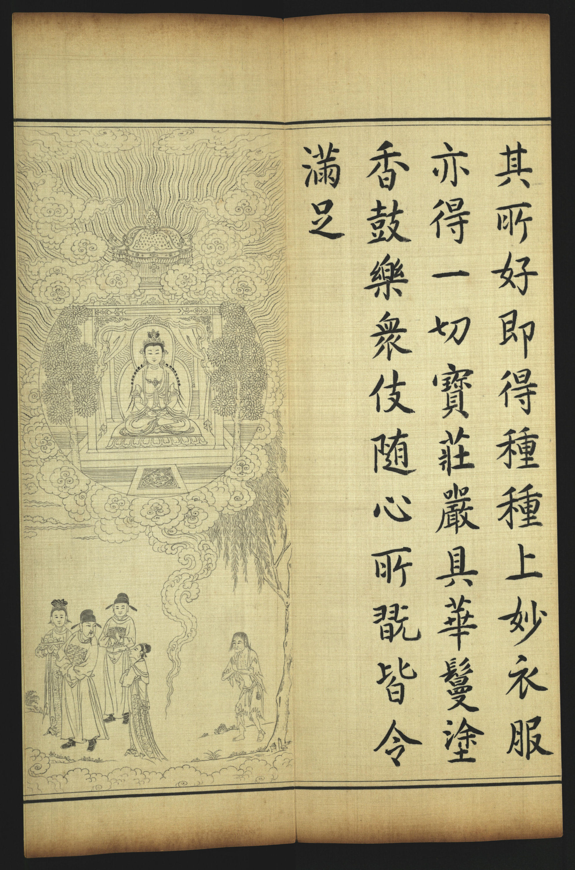 《药师瑠璃光如来本愿功德经》简称《药师经》,玄奘法师译,陈颂东方径琉璃世界药师如来的功德,并详述药师如来因地所发十二大愿。此经册黄地织金丝彩锦云龙纹书衣,正中泥金楷书“药师瑠璃光如来本愿功德经”。经折装,开本30.5 厘米×12.5 厘米,经文116 开,为素绢墨笔楷书,有行格,半开四行,行13 字。精美插图32 幅,经册开端绘刻“释迦佛”开示药师法门。释迦佛,成道相,结跏趺坐背光方形莲花座,左手横放在左脚上,名为“定印”,右手直伸下垂,名“触地印”,身后绘祥云、海水、伞、盖等“佛八宝”图样,“菩萨”、“天王”分供两旁。经册中部绘有日光、月光菩萨像与文殊、观音、大势至、无尽意、宝檀华、药王、药上、弥勒八大菩萨。经册后绘十二药叉大将与四大天王像,以药师佛像为中心分供两旁,尾绘有“韦陀像”。在经册第五开所绘製的承愿佛碑上,有楷书题字:“弘慈正觉,愿立无边。惟瑠璃光,朗照大千。功德普偏,法象昭宣。寒衣饥食,佑善解愆。介寿锡福,燕翼蝉联。家敦忠孝,俗化党偏。兵销刑措,乐利安全。敷天率土,赖是因缘。清宁巩固,万祀延绵。康熙五十二年四月初八日。”上钤朱文方印“康熙御笔之宝”,经册的开端及尾端背面书有密宗根本咒“嗡阿吽”字样,是为开光咒语。