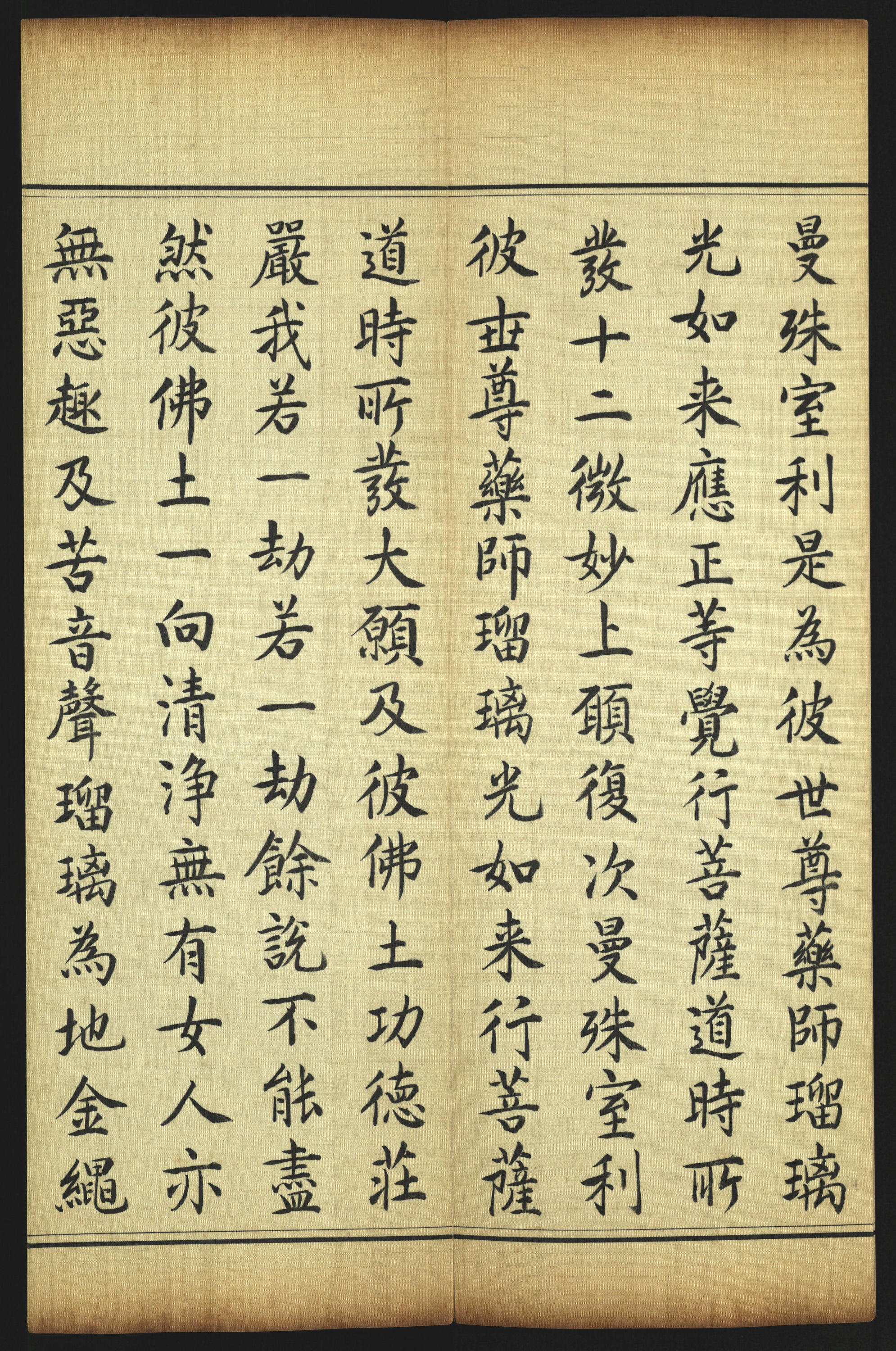 《药师瑠璃光如来本愿功德经》简称《药师经》,玄奘法师译,陈颂东方径琉璃世界药师如来的功德,并详述药师如来因地所发十二大愿。此经册黄地织金丝彩锦云龙纹书衣,正中泥金楷书“药师瑠璃光如来本愿功德经”。经折装,开本30.5 厘米×12.5 厘米,经文116 开,为素绢墨笔楷书,有行格,半开四行,行13 字。精美插图32 幅,经册开端绘刻“释迦佛”开示药师法门。释迦佛,成道相,结跏趺坐背光方形莲花座,左手横放在左脚上,名为“定印”,右手直伸下垂,名“触地印”,身后绘祥云、海水、伞、盖等“佛八宝”图样,“菩萨”、“天王”分供两旁。经册中部绘有日光、月光菩萨像与文殊、观音、大势至、无尽意、宝檀华、药王、药上、弥勒八大菩萨。经册后绘十二药叉大将与四大天王像,以药师佛像为中心分供两旁,尾绘有“韦陀像”。在经册第五开所绘製的承愿佛碑上,有楷书题字:“弘慈正觉,愿立无边。惟瑠璃光,朗照大千。功德普偏,法象昭宣。寒衣饥食,佑善解愆。介寿锡福,燕翼蝉联。家敦忠孝,俗化党偏。兵销刑措,乐利安全。敷天率土,赖是因缘。清宁巩固,万祀延绵。康熙五十二年四月初八日。”上钤朱文方印“康熙御笔之宝”,经册的开端及尾端背面书有密宗根本咒“嗡阿吽”字样,是为开光咒语。