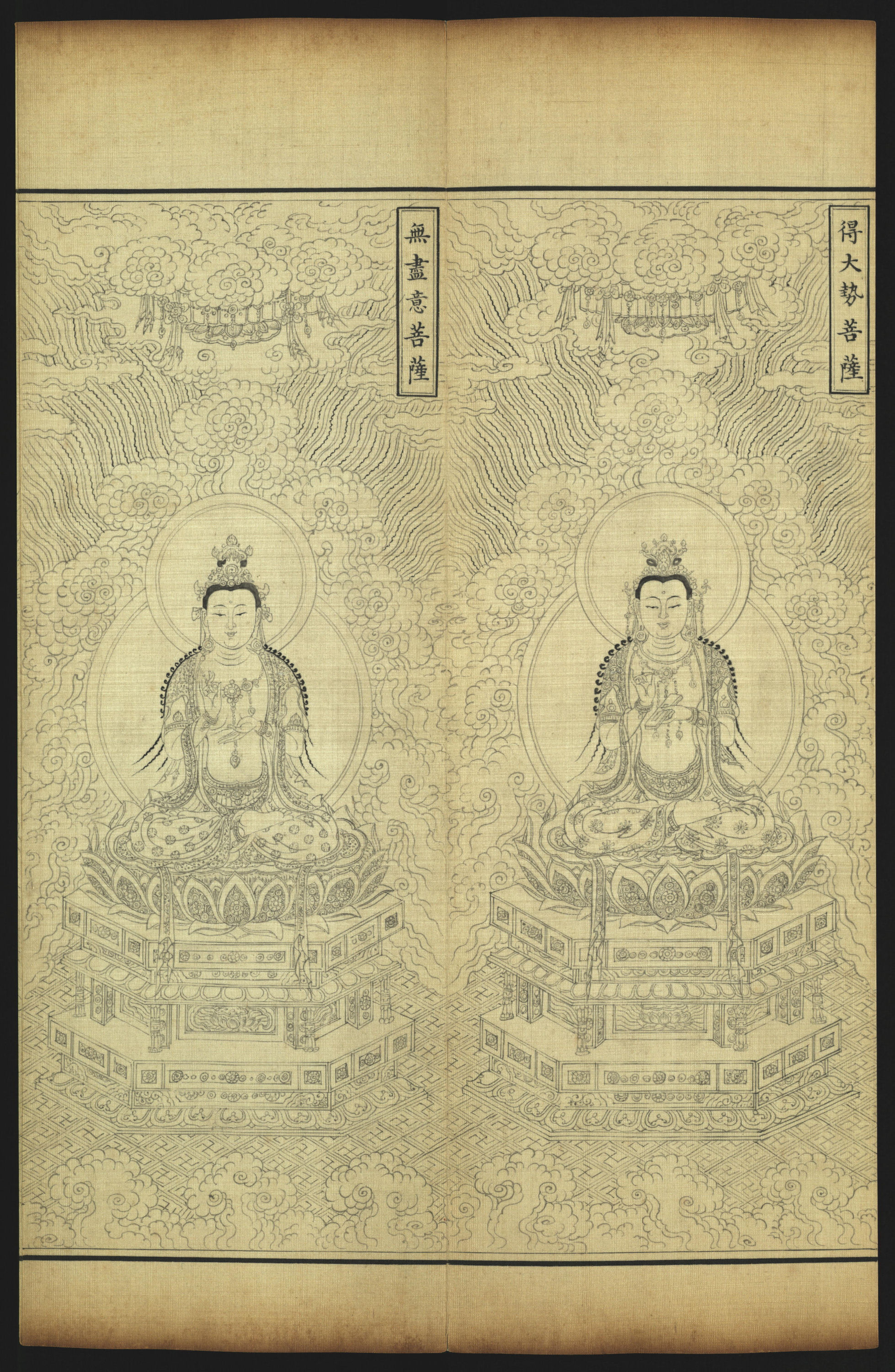 《药师瑠璃光如来本愿功德经》简称《药师经》,玄奘法师译,陈颂东方径琉璃世界药师如来的功德,并详述药师如来因地所发十二大愿。此经册黄地织金丝彩锦云龙纹书衣,正中泥金楷书“药师瑠璃光如来本愿功德经”。经折装,开本30.5 厘米×12.5 厘米,经文116 开,为素绢墨笔楷书,有行格,半开四行,行13 字。精美插图32 幅,经册开端绘刻“释迦佛”开示药师法门。释迦佛,成道相,结跏趺坐背光方形莲花座,左手横放在左脚上,名为“定印”,右手直伸下垂,名“触地印”,身后绘祥云、海水、伞、盖等“佛八宝”图样,“菩萨”、“天王”分供两旁。经册中部绘有日光、月光菩萨像与文殊、观音、大势至、无尽意、宝檀华、药王、药上、弥勒八大菩萨。经册后绘十二药叉大将与四大天王像,以药师佛像为中心分供两旁,尾绘有“韦陀像”。在经册第五开所绘製的承愿佛碑上,有楷书题字:“弘慈正觉,愿立无边。惟瑠璃光,朗照大千。功德普偏,法象昭宣。寒衣饥食,佑善解愆。介寿锡福,燕翼蝉联。家敦忠孝,俗化党偏。兵销刑措,乐利安全。敷天率土,赖是因缘。清宁巩固,万祀延绵。康熙五十二年四月初八日。”上钤朱文方印“康熙御笔之宝”,经册的开端及尾端背面书有密宗根本咒“嗡阿吽”字样,是为开光咒语。