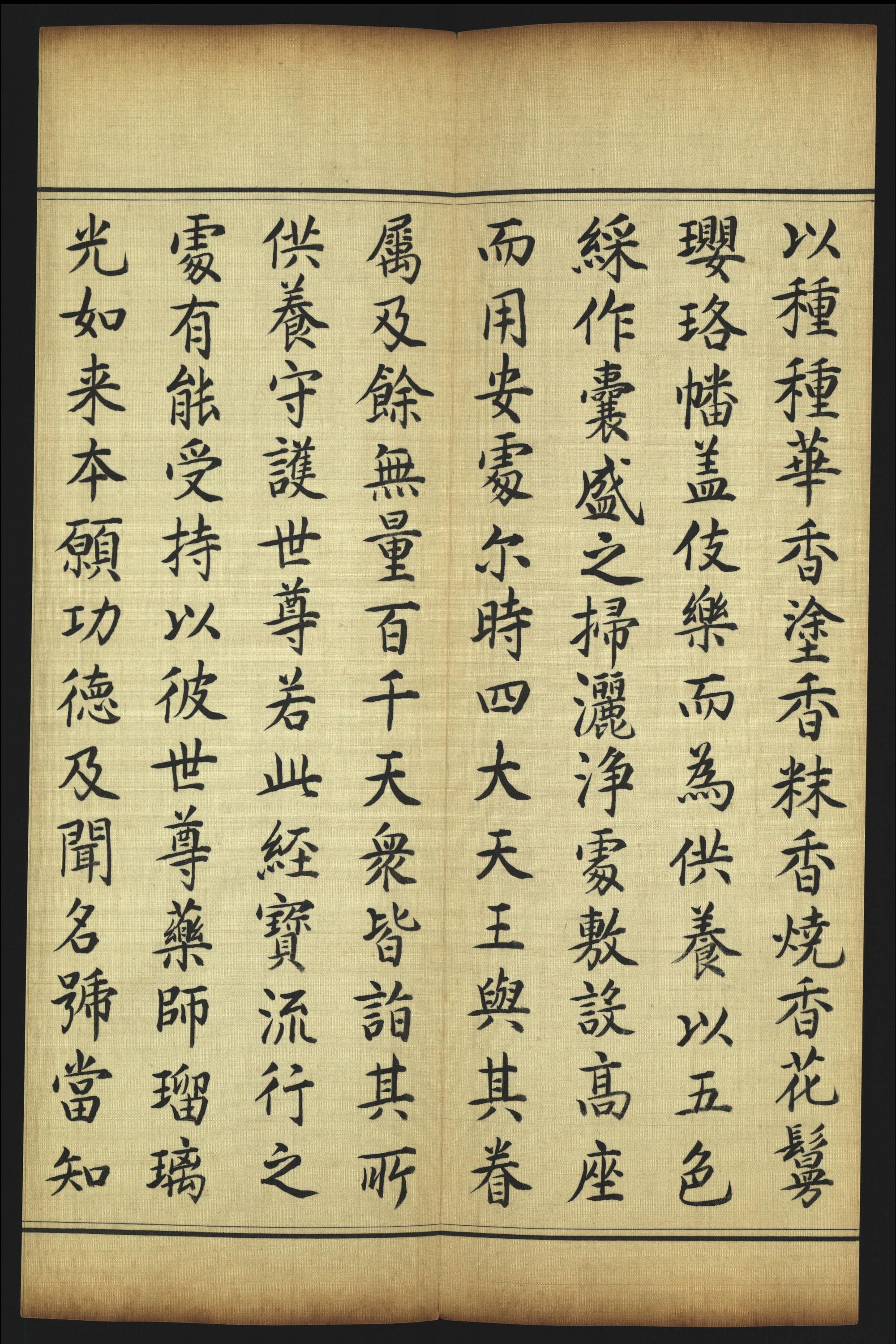《药师瑠璃光如来本愿功德经》简称《药师经》,玄奘法师译,陈颂东方径琉璃世界药师如来的功德,并详述药师如来因地所发十二大愿。此经册黄地织金丝彩锦云龙纹书衣,正中泥金楷书“药师瑠璃光如来本愿功德经”。经折装,开本30.5 厘米×12.5 厘米,经文116 开,为素绢墨笔楷书,有行格,半开四行,行13 字。精美插图32 幅,经册开端绘刻“释迦佛”开示药师法门。释迦佛,成道相,结跏趺坐背光方形莲花座,左手横放在左脚上,名为“定印”,右手直伸下垂,名“触地印”,身后绘祥云、海水、伞、盖等“佛八宝”图样,“菩萨”、“天王”分供两旁。经册中部绘有日光、月光菩萨像与文殊、观音、大势至、无尽意、宝檀华、药王、药上、弥勒八大菩萨。经册后绘十二药叉大将与四大天王像,以药师佛像为中心分供两旁,尾绘有“韦陀像”。在经册第五开所绘製的承愿佛碑上,有楷书题字:“弘慈正觉,愿立无边。惟瑠璃光,朗照大千。功德普偏,法象昭宣。寒衣饥食,佑善解愆。介寿锡福,燕翼蝉联。家敦忠孝,俗化党偏。兵销刑措,乐利安全。敷天率土,赖是因缘。清宁巩固,万祀延绵。康熙五十二年四月初八日。”上钤朱文方印“康熙御笔之宝”,经册的开端及尾端背面书有密宗根本咒“嗡阿吽”字样,是为开光咒语。