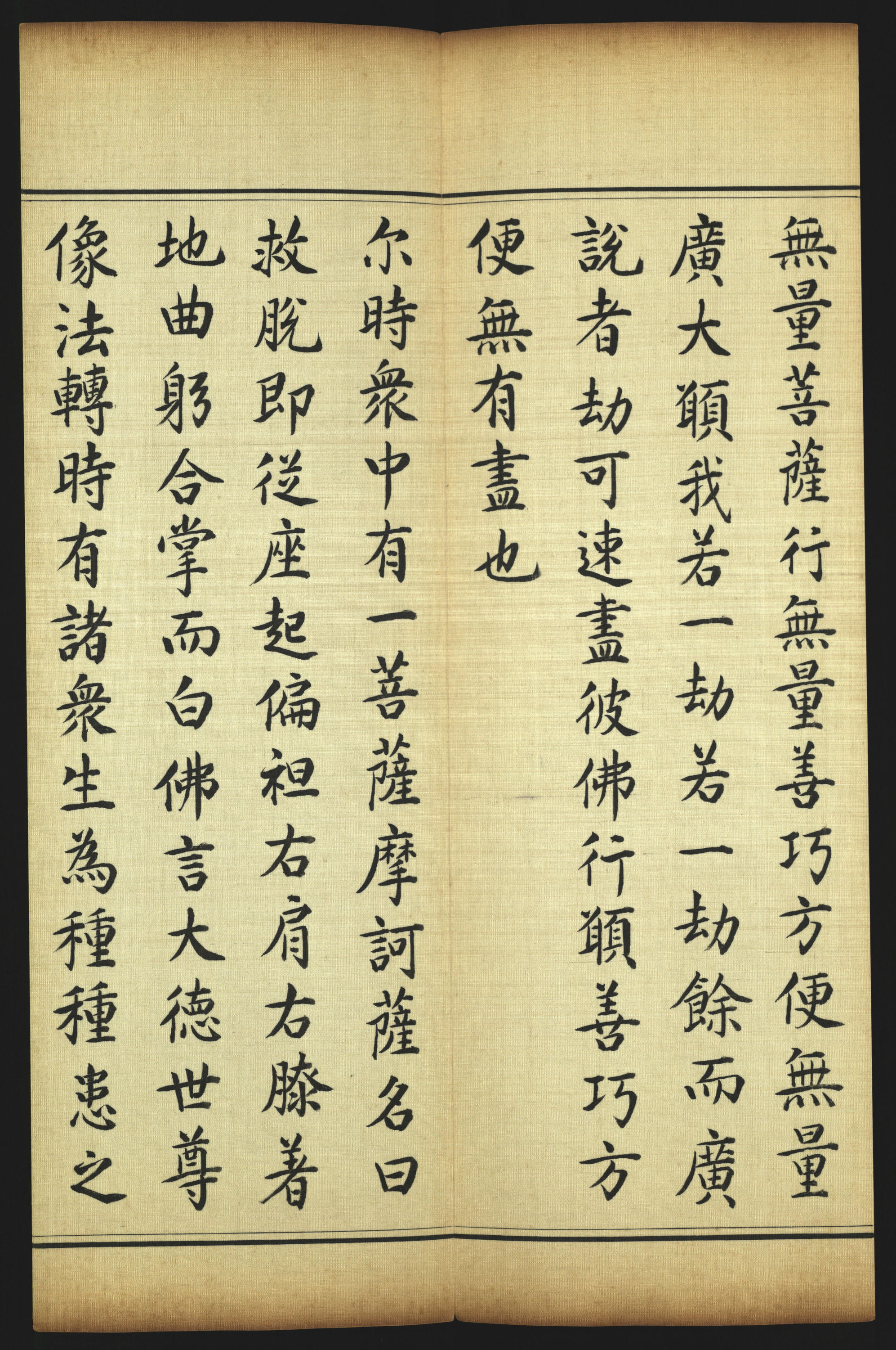 《药师瑠璃光如来本愿功德经》简称《药师经》,玄奘法师译,陈颂东方径琉璃世界药师如来的功德,并详述药师如来因地所发十二大愿。此经册黄地织金丝彩锦云龙纹书衣,正中泥金楷书“药师瑠璃光如来本愿功德经”。经折装,开本30.5 厘米×12.5 厘米,经文116 开,为素绢墨笔楷书,有行格,半开四行,行13 字。精美插图32 幅,经册开端绘刻“释迦佛”开示药师法门。释迦佛,成道相,结跏趺坐背光方形莲花座,左手横放在左脚上,名为“定印”,右手直伸下垂,名“触地印”,身后绘祥云、海水、伞、盖等“佛八宝”图样,“菩萨”、“天王”分供两旁。经册中部绘有日光、月光菩萨像与文殊、观音、大势至、无尽意、宝檀华、药王、药上、弥勒八大菩萨。经册后绘十二药叉大将与四大天王像,以药师佛像为中心分供两旁,尾绘有“韦陀像”。在经册第五开所绘製的承愿佛碑上,有楷书题字:“弘慈正觉,愿立无边。惟瑠璃光,朗照大千。功德普偏,法象昭宣。寒衣饥食,佑善解愆。介寿锡福,燕翼蝉联。家敦忠孝,俗化党偏。兵销刑措,乐利安全。敷天率土,赖是因缘。清宁巩固,万祀延绵。康熙五十二年四月初八日。”上钤朱文方印“康熙御笔之宝”,经册的开端及尾端背面书有密宗根本咒“嗡阿吽”字样,是为开光咒语。