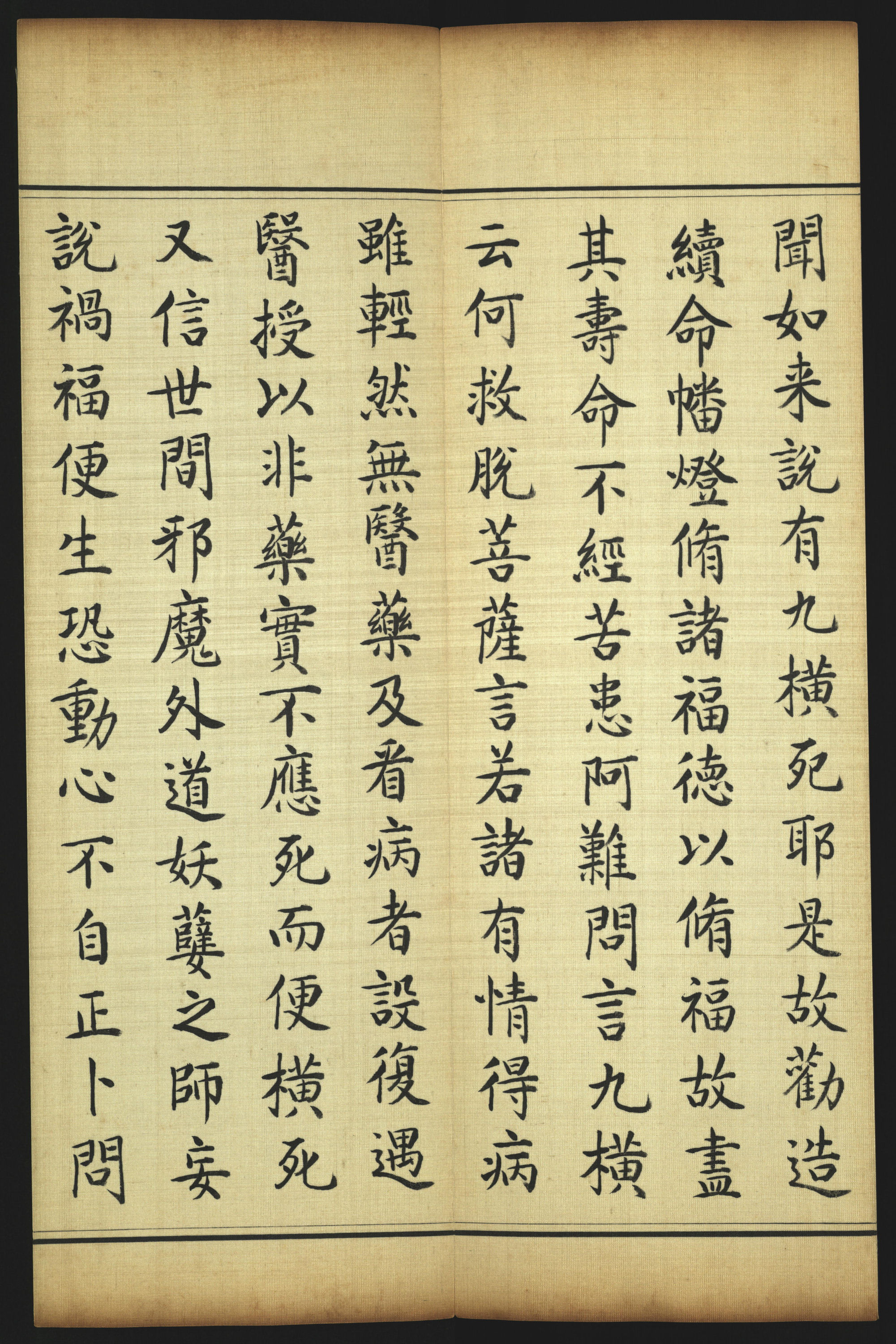 《药师瑠璃光如来本愿功德经》简称《药师经》,玄奘法师译,陈颂东方径琉璃世界药师如来的功德,并详述药师如来因地所发十二大愿。此经册黄地织金丝彩锦云龙纹书衣,正中泥金楷书“药师瑠璃光如来本愿功德经”。经折装,开本30.5 厘米×12.5 厘米,经文116 开,为素绢墨笔楷书,有行格,半开四行,行13 字。精美插图32 幅,经册开端绘刻“释迦佛”开示药师法门。释迦佛,成道相,结跏趺坐背光方形莲花座,左手横放在左脚上,名为“定印”,右手直伸下垂,名“触地印”,身后绘祥云、海水、伞、盖等“佛八宝”图样,“菩萨”、“天王”分供两旁。经册中部绘有日光、月光菩萨像与文殊、观音、大势至、无尽意、宝檀华、药王、药上、弥勒八大菩萨。经册后绘十二药叉大将与四大天王像,以药师佛像为中心分供两旁,尾绘有“韦陀像”。在经册第五开所绘製的承愿佛碑上,有楷书题字:“弘慈正觉,愿立无边。惟瑠璃光,朗照大千。功德普偏,法象昭宣。寒衣饥食,佑善解愆。介寿锡福,燕翼蝉联。家敦忠孝,俗化党偏。兵销刑措,乐利安全。敷天率土,赖是因缘。清宁巩固,万祀延绵。康熙五十二年四月初八日。”上钤朱文方印“康熙御笔之宝”,经册的开端及尾端背面书有密宗根本咒“嗡阿吽”字样,是为开光咒语。