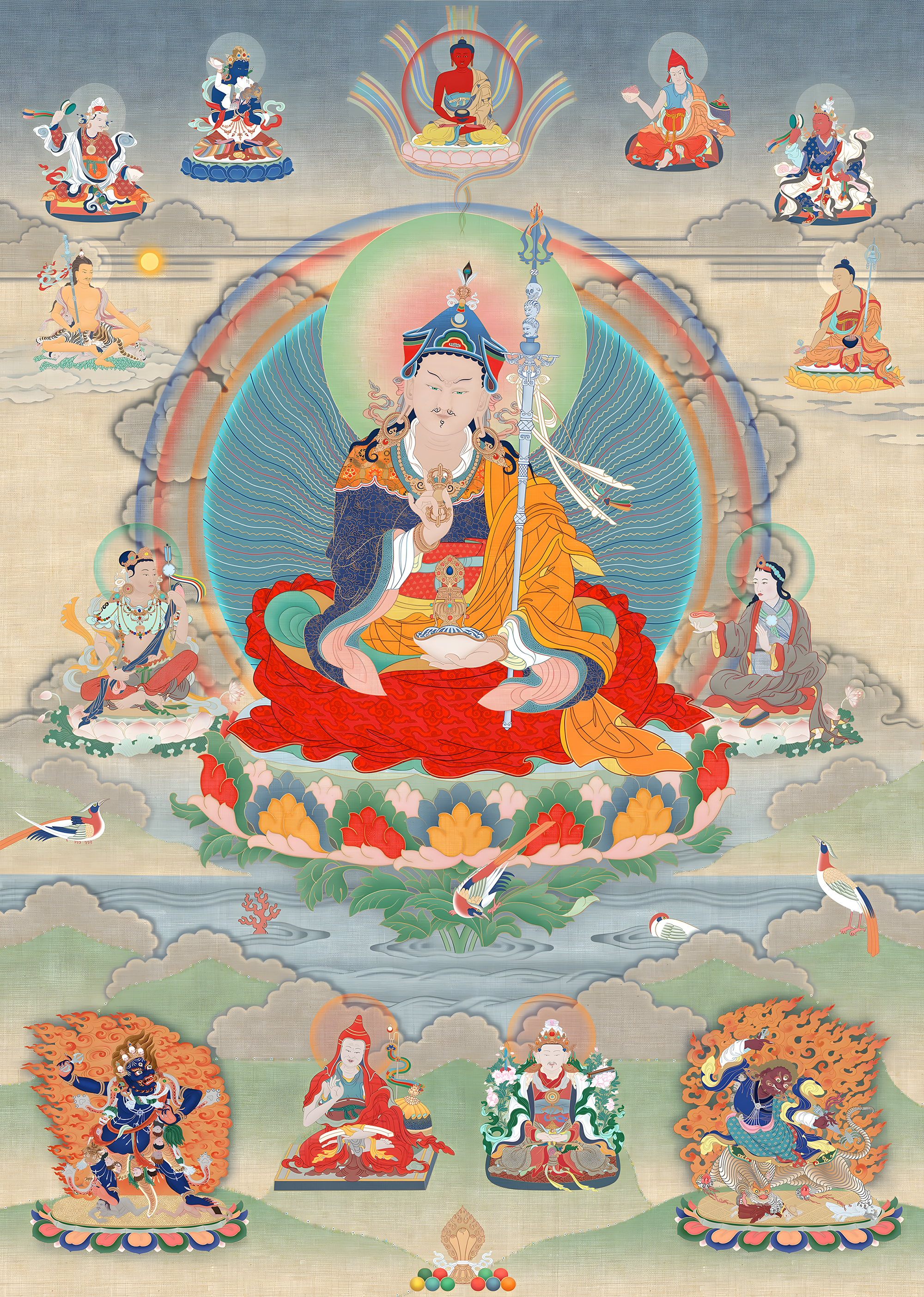莲 师 八 相 的 起 源 为了利益众生,莲花生大师以八种不同形态现于世,又称莲师八相或莲师八变,八个化身分别为海生金刚、释迦狮子、日光上师、爱慧上师、狮子吼、莲花王、忿怒金刚、班玛托创咂、莲花生大师。