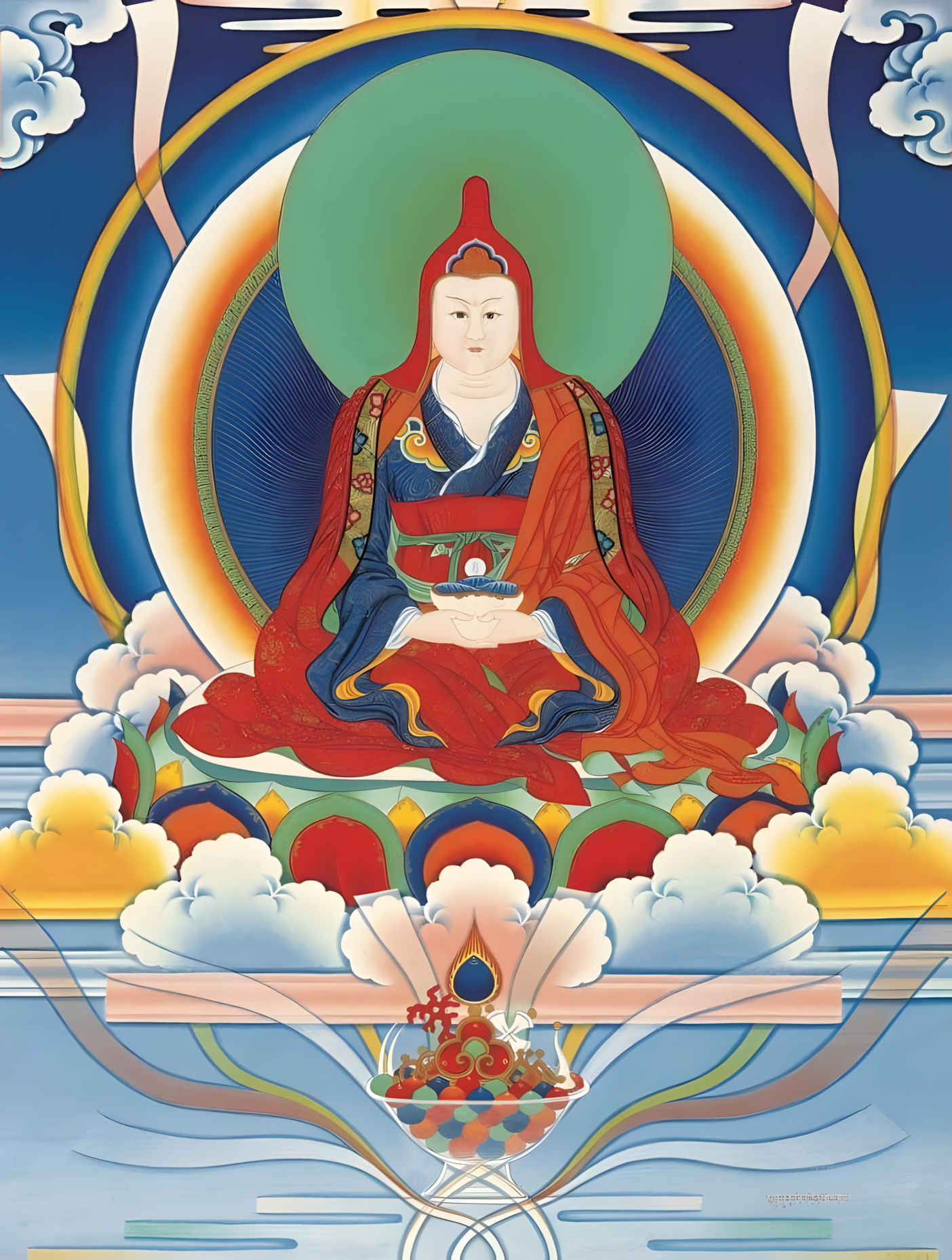 莲师十三法──主尊:贝玛桑拔瓦 贝玛桑拔瓦,总摄佛、法、僧三宝与上师、本尊、护法三根本。为莲师八变之一。身粉红色,双手结定印,手上托宝钵。着三法衣,内穿白色,表密乘圆满;中间着蓝挂,表大乘圆满;外罩红色,表小乘圆满。顶戴紫红色班智达帽;以双跏趺坐于莲花日月轮上。