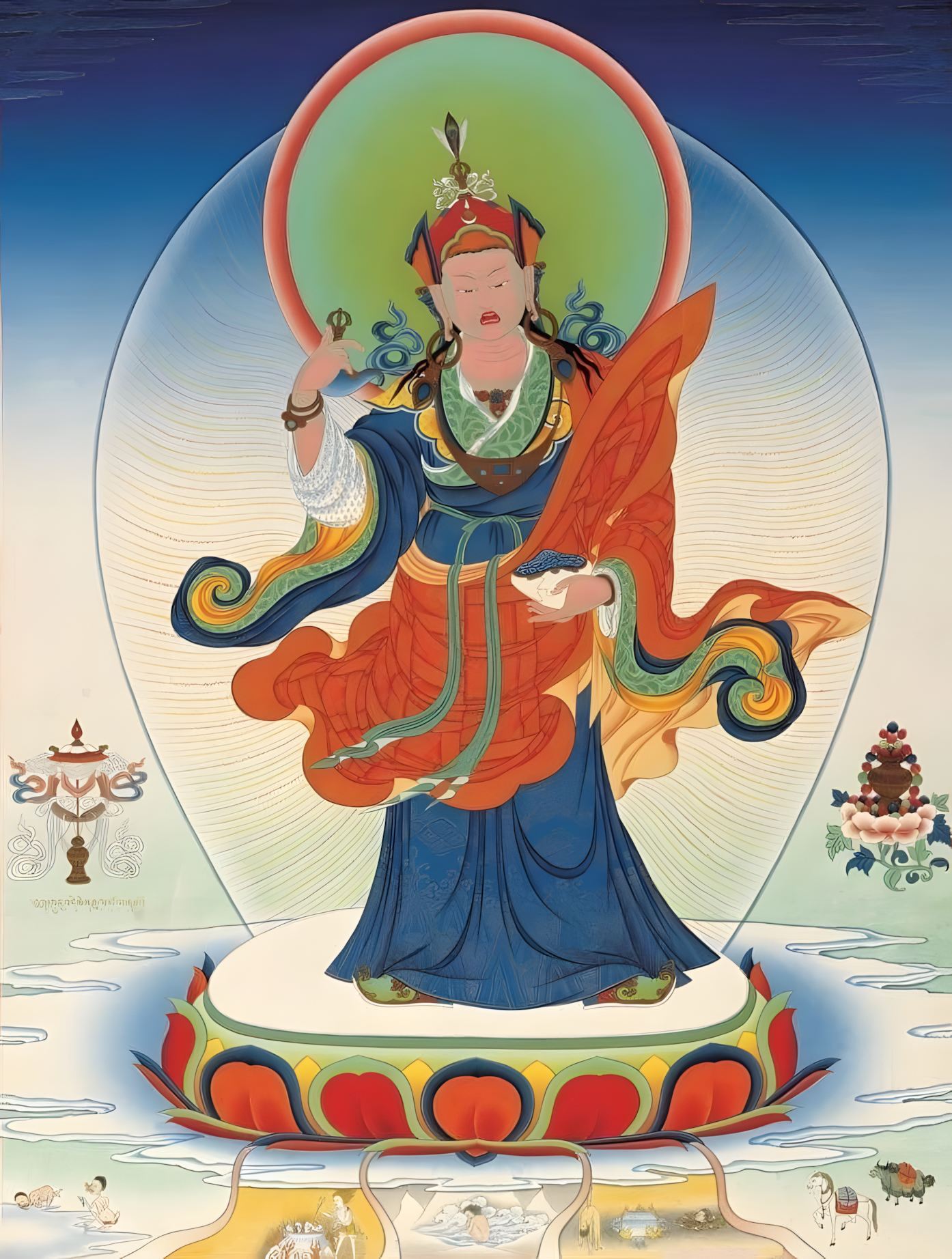 莲师十三法──外西北:莲师解脱轮回 亦名:上师断轮回苦;藏名:咕噜见松棍坚。身红绿色穿白、兰、红三法衣,右手持钺刀,左手托盈满甘露之嘎巴拉。威立于坛城外围西北之莲花上。主地狱、饿鬼、畜生三恶道遮止。