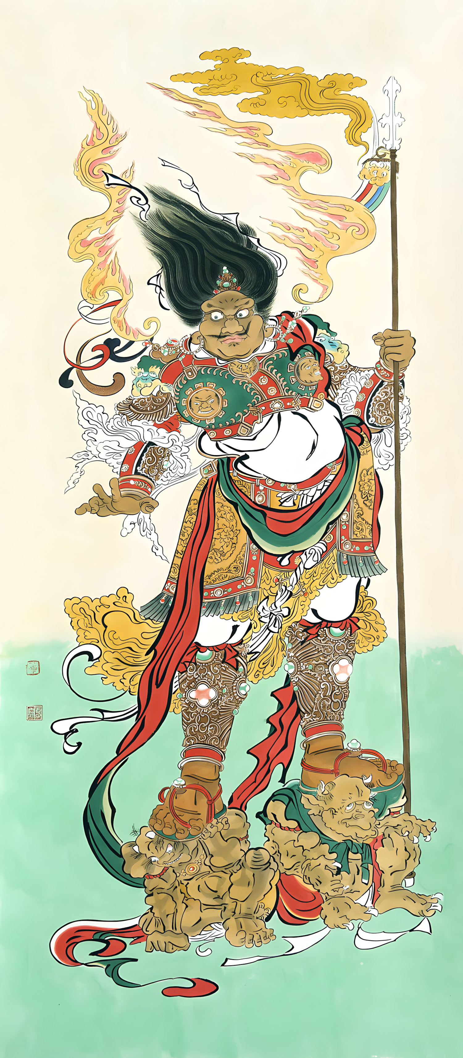 北方多闻天王:“多闻”意为颇精通佛法,以福、德闻于四方。住须弥山黄金埵,他负责守护北俱芦洲,以夜叉与罗刹为多闻天王的部众,是“二十诸天”中的第三天王。