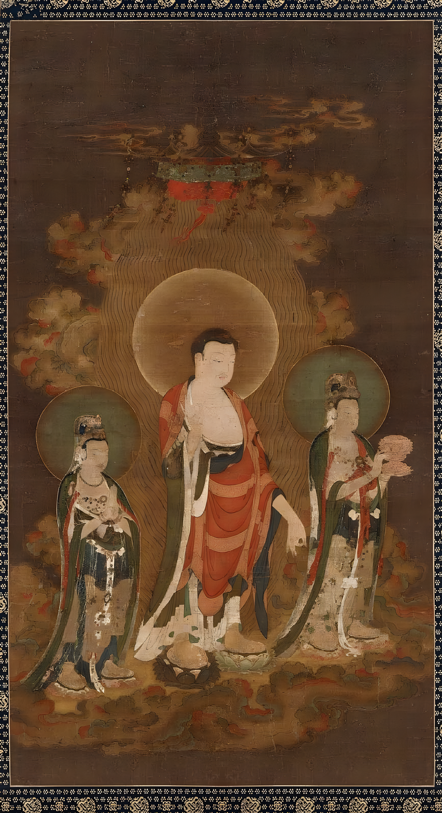 《西方三圣行云图》绢本设色,97.1×53.8cm,美国波士顿美术馆藏。 图中央主尊为阿弥陀佛,右边手捧莲台,头上有坐佛的是观世音菩萨,左边头上有宝瓶者为大势至。这张画作画的内容是佛教绘画中的〈来迎图〉,指西方三圣出现于往生者面前,接引其往西方极乐世界。
