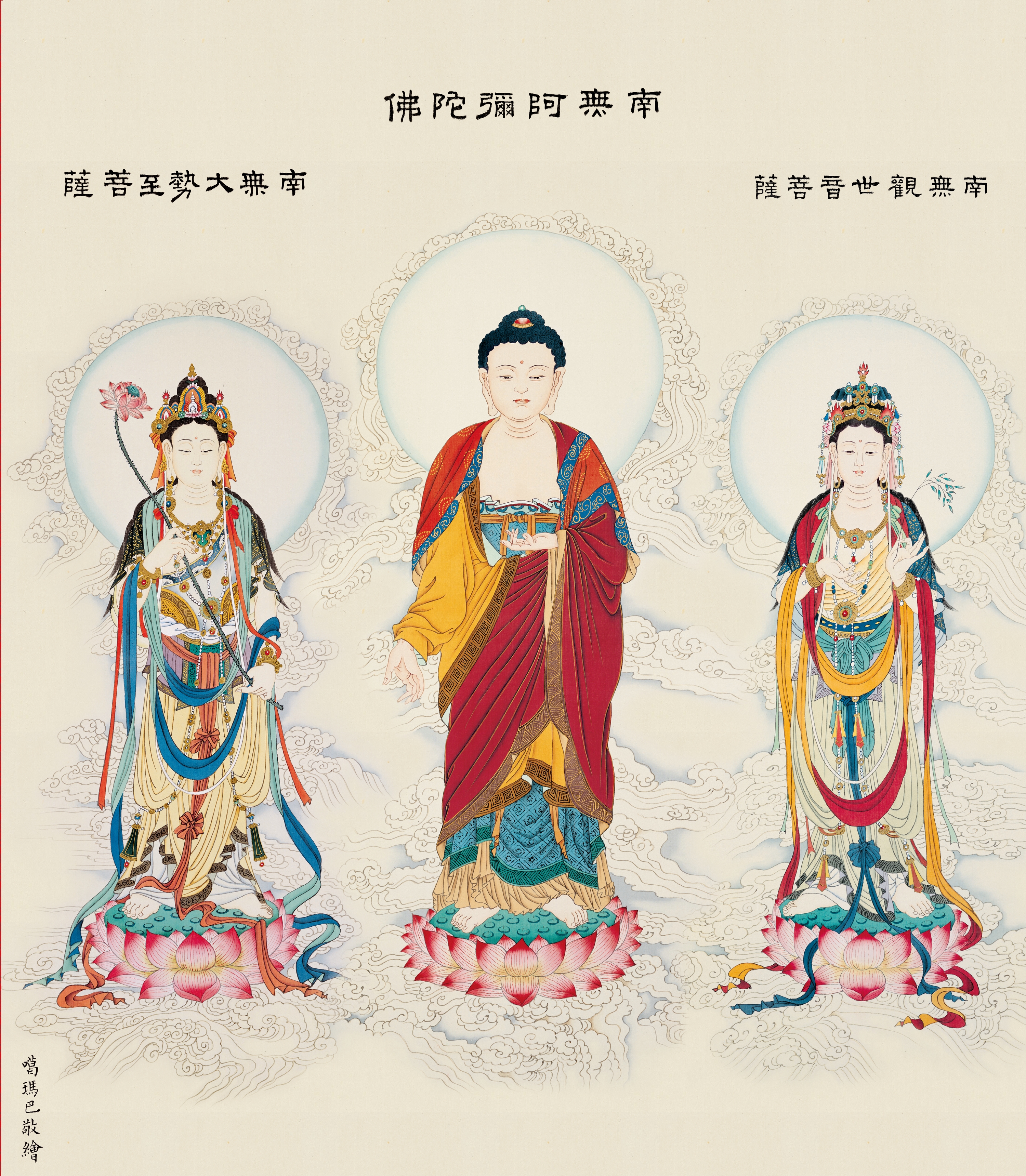 西方三圣 (绢布)(故宫黑檀头木棍轴)(卷轴) 噶玛巴敬绘【大图编号-A1014】 47.5_91cm_3000x3439_meet.fo