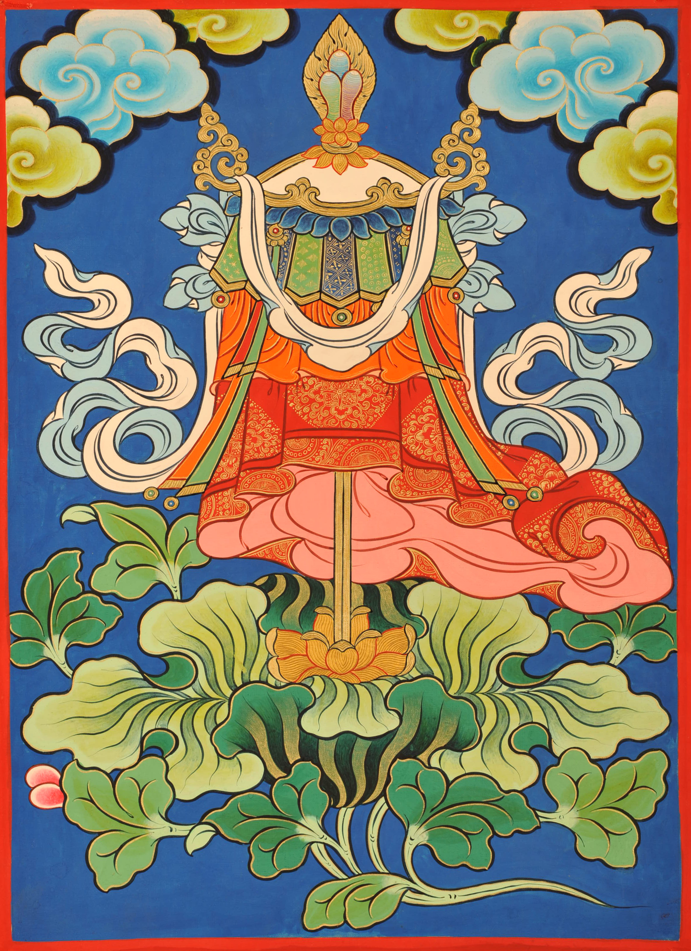 藏语称"斗"。古印度时,贵族、皇室成员出行时,以伞蔽阳,后演化为仪仗器具,寓意为至上权威。佛教以伞象征遮蔽魔障,守护佛法。藏传佛教亦认为,宝伞象征着佛陀教诲的权威。