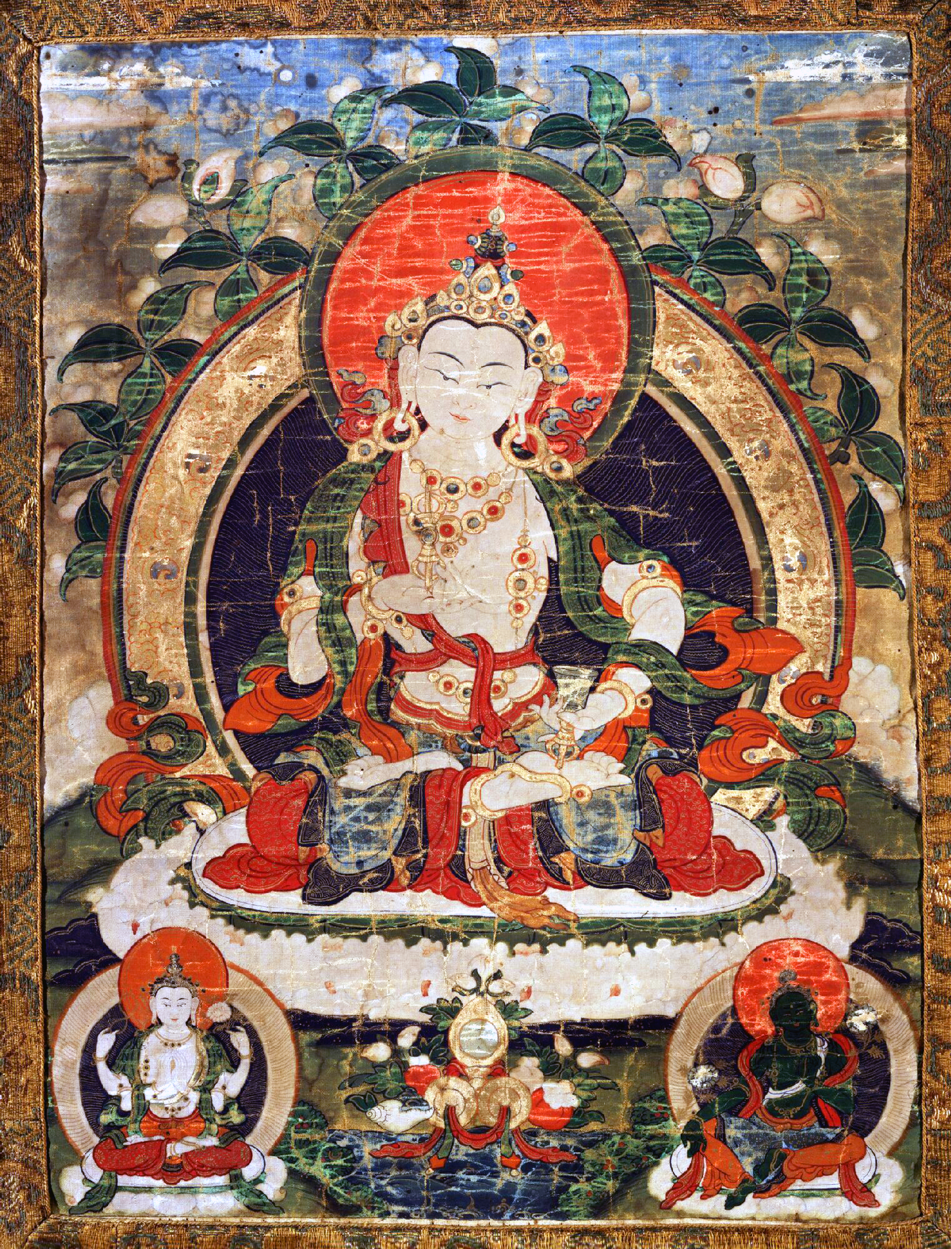莲花座左下角的是白色的四臂观世音菩萨安住在莲花月轮之上,右下角的是绿度母安坐在莲花月轮之上。中央是供奉的白海螺、珠宝、供果等各式供品。