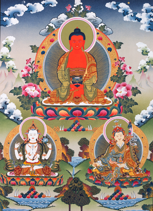 西藏唐卡.ZP-0055.阿弥陀佛.四臂观音.莲花生大士