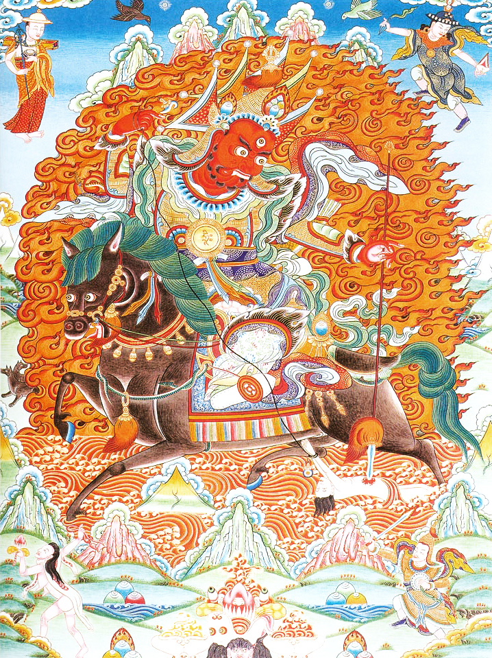 夜叉孜玛热。孜玛护法又称紫玛或孜玛热,为宁玛派的主要护法之一。孜玛热为藏地最凶猛的"赞"神的首领,同时还兼有冥府判官的身份,赞与魔相配而生,尤其是勇力夜叉军主孜玛热是三界众生的命主,能刹那围绕三界抛红索钩招敌魂,刺燃烧之赞矛。