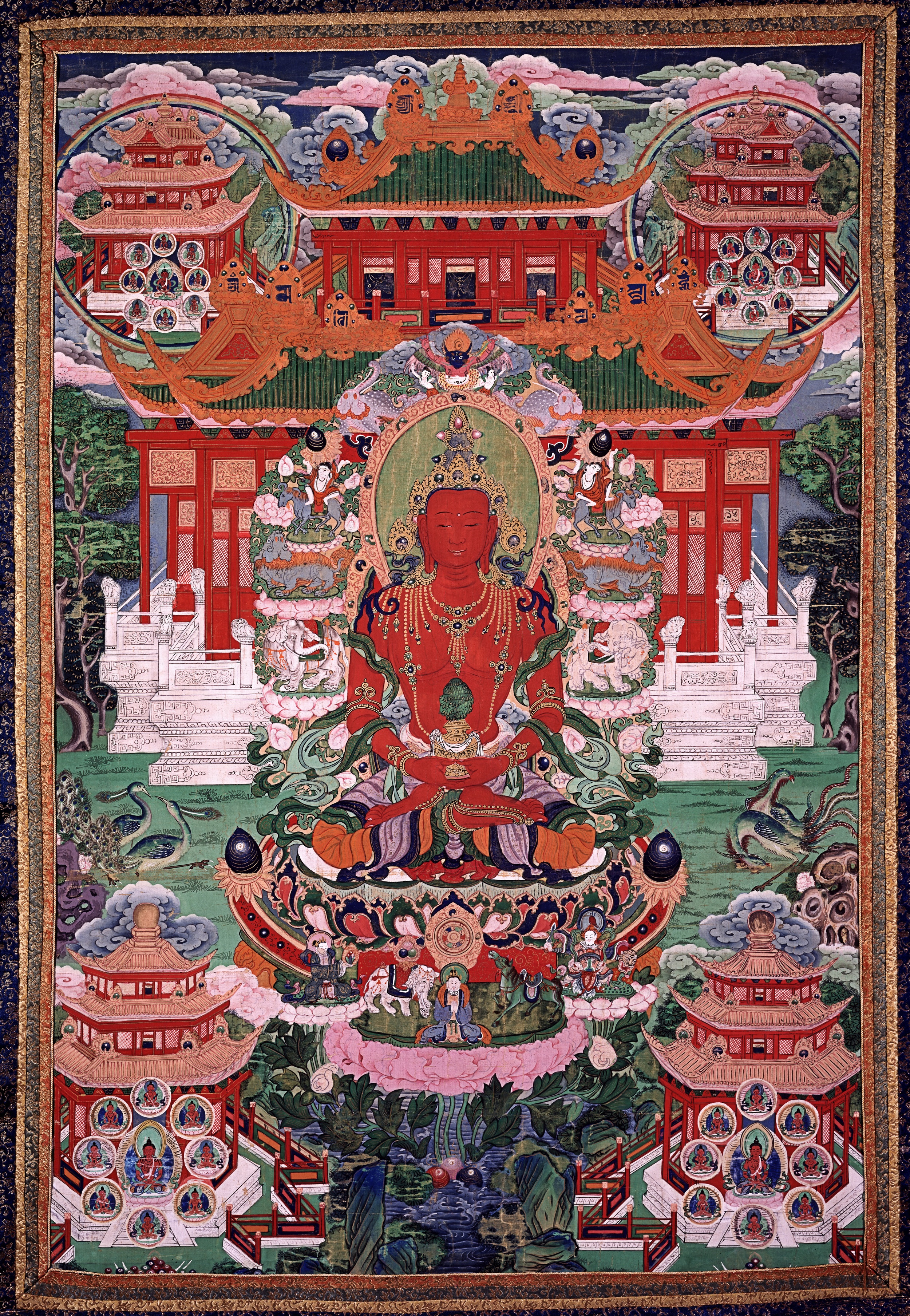 西藏唐卡_无量寿佛净土像_绢本74x107_【大图编号-A1696】_2500x3615_meet.fo