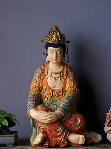 樟木 | 木雕彩绘观音 雕刻工致腴净,满施彩绘描金,色彩过渡自然,细节纹饰清晰,足见用工用心。整体气貌如生,华贵殊胜,神韵自在宁和。