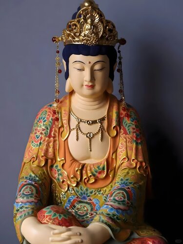 樟木 | 木雕彩绘观音 雕刻工致腴净,满施彩绘描金,色彩过渡自然,细节纹饰清晰,足见用工用心。整体气貌如生,华贵殊胜,神韵自在宁和。