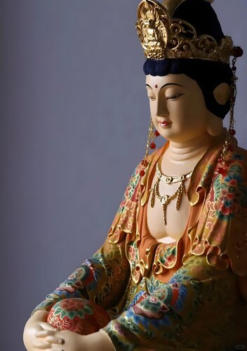 樟木 | 木雕彩绘观音 雕刻工致腴净,满施彩绘描金,色彩过渡自然,细节纹饰清晰,足见用工用心。整体气貌如生,华贵殊胜,神韵自在宁和。
