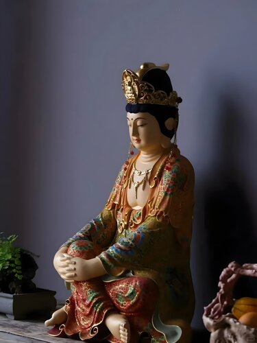 樟木 | 木雕彩绘观音 雕刻工致腴净,满施彩绘描金,色彩过渡自然,细节纹饰清晰,足见用工用心。整体气貌如生,华贵殊胜,神韵自在宁和。