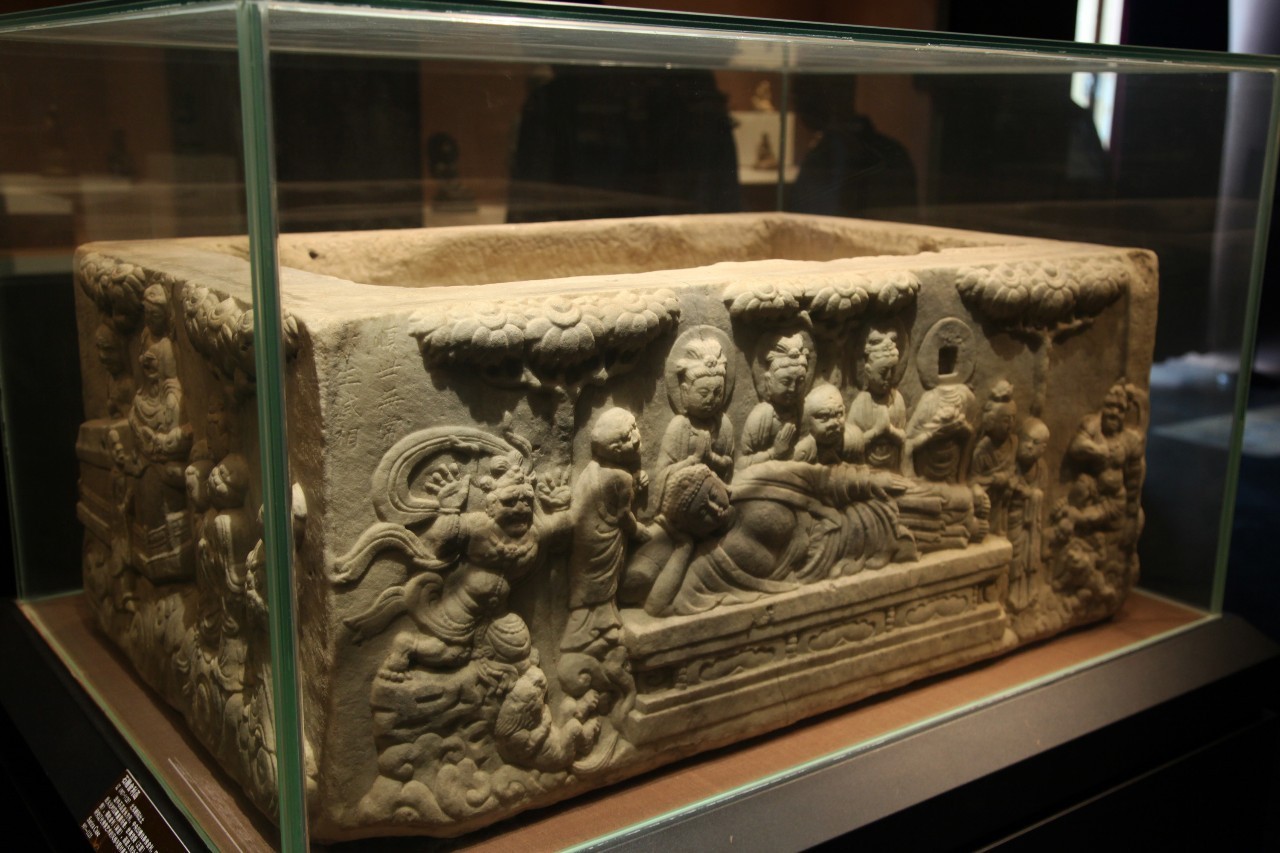 舍利是是释迦牟尼佛遗体火化后结成的珠体,随着佛法的传播而被供奉于各地寺庙。收藏舍利的容器叫舍利函,它一般有七重函,从小到大,层层嵌套,一般里面的六层函是金属质地,最外面的一层是石函, 这个石函本身有个盖子,出土时丢失了,它的四壁用连环画的形式表现出佛祖涅槃升天时的四个重要场景。