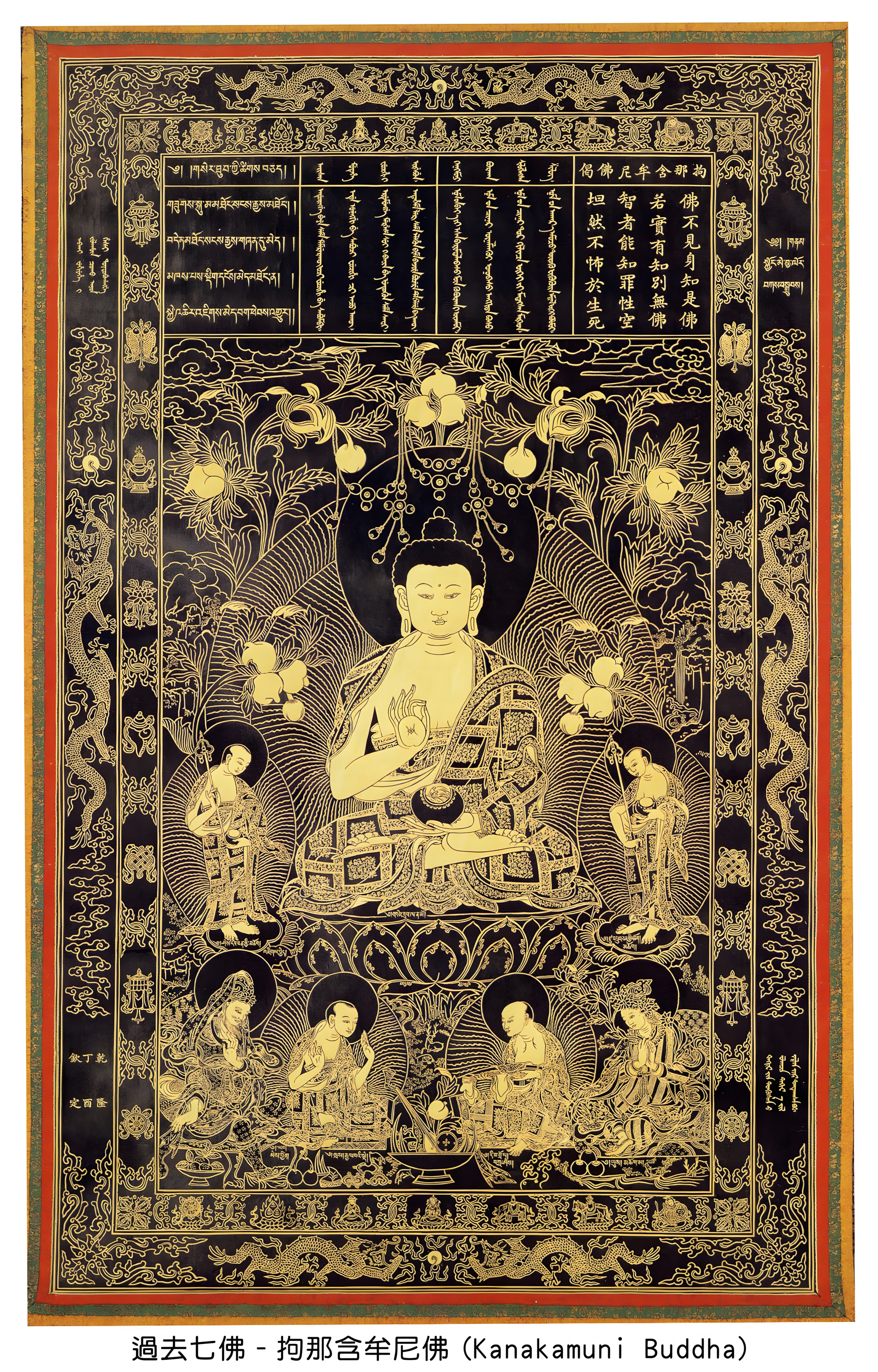 拘那含牟尼佛是过去七佛中之第五佛,亦为贤劫千佛之第二佛,其名意为金色仙、金寂。依《长阿含经》卷一等所述,此佛生于清净城,人寿三万岁。画中绘拘那含牟尼佛左手托钵于腹前,右手当胸结说法印,结跏趺坐,于乌暂婆罗树下成佛。二神足弟子舒槃那多、郁多罗持锡杖侍立两侧,右下为奉侍弟子安和,与之对坐者为佛子,译名王军。画面左右下角绘佛父母形象,俱着世人装,其父名大德,母名善胜,婆罗门种姓。幅面上端以汉满蒙藏四体文字金书拘那含牟尼佛偈,其中汉文为:“佛不见身知是佛,若实有知别无佛,智者能知罪性空,坦然不怖于生死。” 画面边括双框,外框上下绘双龙戏珠,两侧为升龙逐宝图案,栏内四隅以汉满蒙藏四体文字署“乾隆丁酉钦定”款,内框上下绘七珍,左右画八宝。