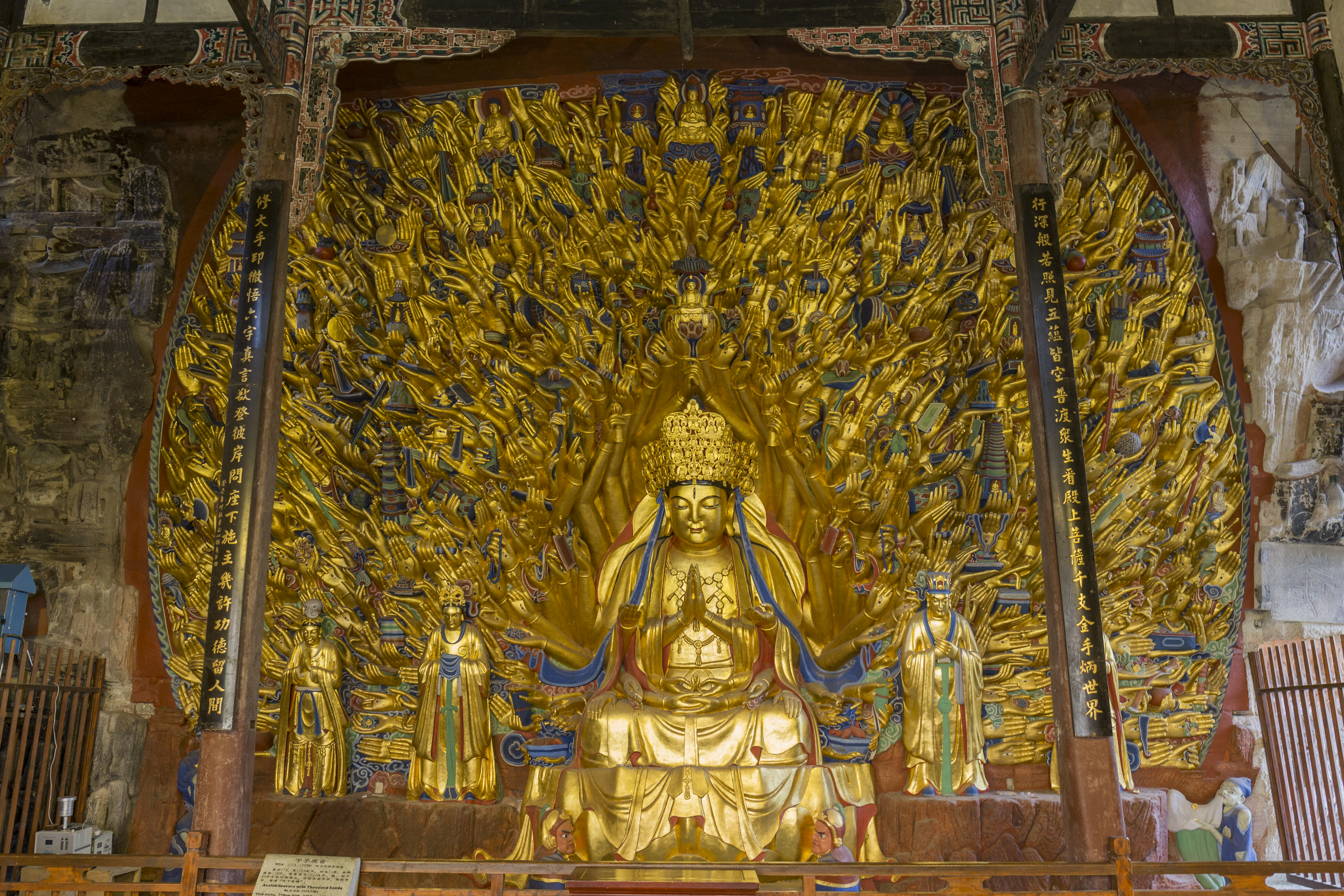 大足石刻千手观音,是位于中国西南部重庆市大足区境内,以千手观音为主体景观的大足石刻精品景区,是唐末、宋初时期的宗教摩崖石刻,以佛教题材为主,是中国著名的古代石刻艺术,是中国晚期石窟造像艺术的典范,规模宏大、艺术精湛、内容丰富,与敦煌莫高窟、云冈石窟、龙门石窟齐名。