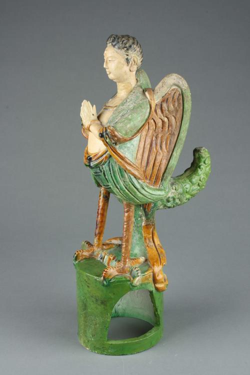 这件黄绿釉迦陵频伽,脊饰胎质灰白且坚硬,表面釉色有红、绿、黄三彩。从装饰技法来说,它汇集了多种装饰手法,以雕刻为主,兼用刻、剔、绘、模印及贴塑等,充分展示了磁州窑工匠的高超技艺和烧造水平,是金代建筑装饰的珍品。再说造型,这件迦陵频伽人首鸟身,腹部以上为人形,头梳发髻,面部丰满慈祥,两手合掌于胸前。腹部以下为鸟足,双腿连爪抓立于底座上。背后还有双翅,羽翼丰满,尾巴向上翘起,造型非常优美。