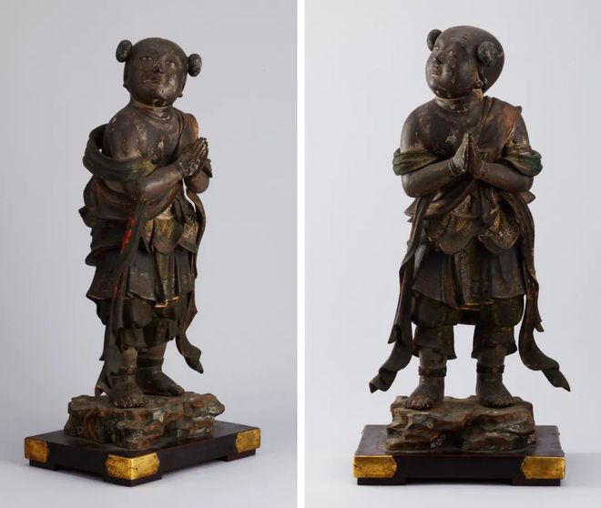 善财童子像 该群雕像又被称为五台山文殊或渡海文殊,是基于中国五台台是文殊圣地这一信仰背景所产生出来的图像,而渡海而来这一表现则是日本所特有的。该像底座框架上绘有海浪。将文殊菩萨作成头顶5个发髻的少年容貌是源于经典中所述“童子相”,表达文殊的智慧犹如孩童般清明。侍从中的幼童造型为善才童子。《华严经》中记载了善财童子遵从文殊菩萨的指引,遍访53位善知识终于悟得菩萨修行的故事。