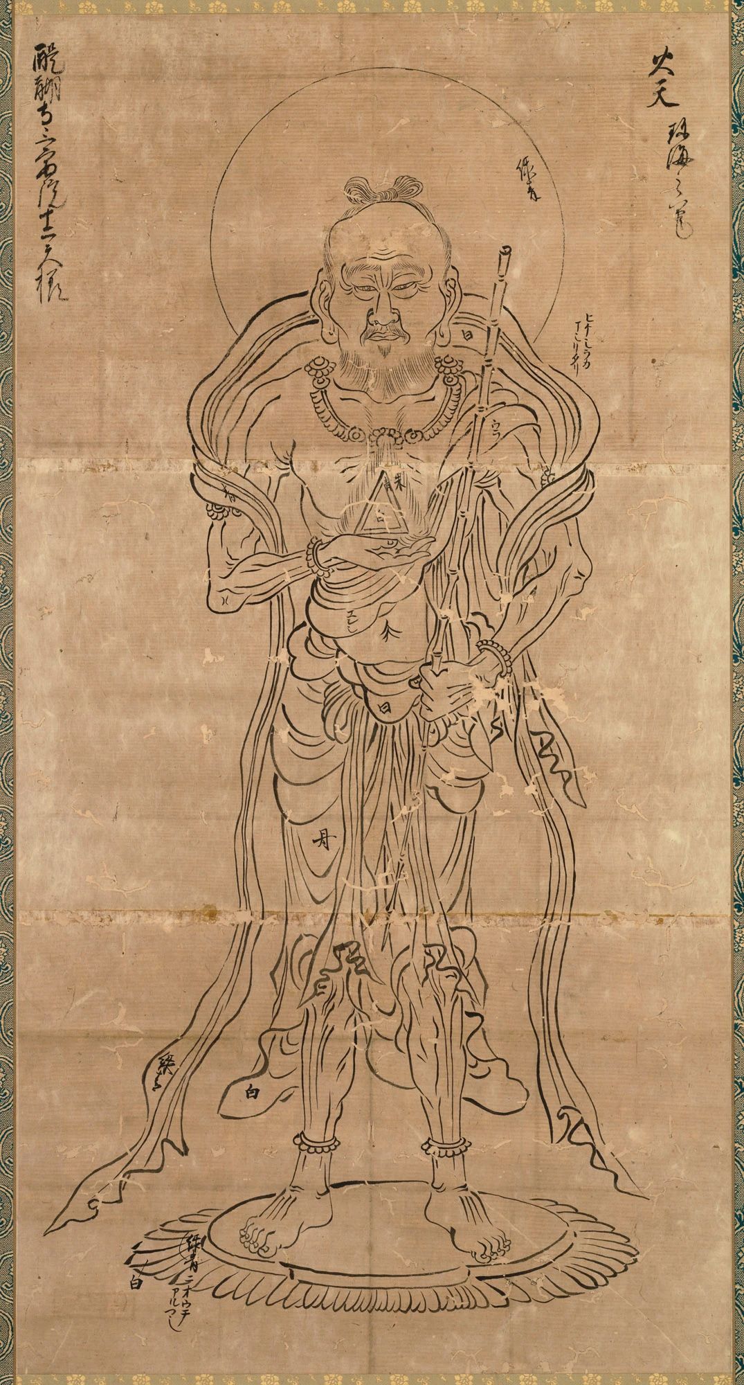本图为珍海(1092~1152)日本,仿照醍醐寺三宝院相传的十二天像的图像临摹而成,在现存的十二天像立像中属于最古老的白描图像。本馆馆藏的帝释天、火天、阎魔、月天、风天、昆沙门天、日天的6幅画像上各处均有颜色指示,一般认为其可能是作为彩色画制作的备忘录制作而成的。珍海为画师春日基光之子,于东大寺学习华严教学等,于醍醐寺、劝修寺受密教之法。曾担任东大寺的讲师及醍醐寺的学头(寺院的职务名称),同时精于画技,因致力于佛画的制作及修理而为人所知,除本作品外还流传有被认出自珍海的数件作品。