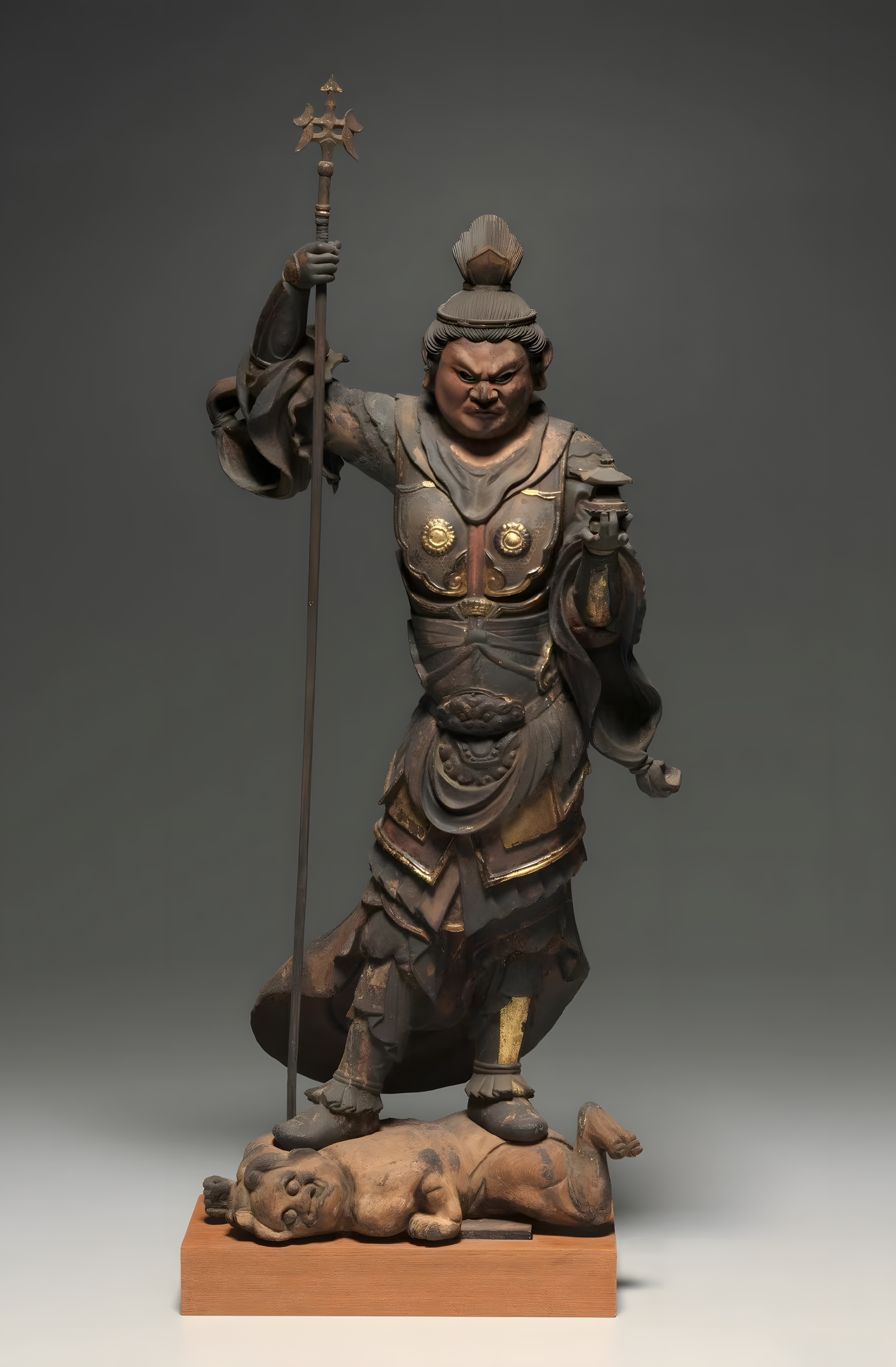 【镰仓时代木雕彩绘毘沙門天像】规格:76.8 x 28.6 cm克利夫兰美术馆藏雕塑看图片尺寸不大,其实也有接近八十厘米,总体雕工精湛,反映了镰仓时代日本匠人的匠心。毘沙門天即「多闻天」,是佛教中的四大天王之一,负责守护须弥山的北方,以武神的形象示人,历来在信众间具有特殊地位。近年来,日本接连发现了几尊重要的毗沙门天像,如制作于8世纪的木心干漆造像(爱媛县如法寺)、具有绘画般跃动感的京都弘源寺像、珍贵的平安时代(1124年)雕像(私人藏品)等,极大地推进了佛像研究的进展。