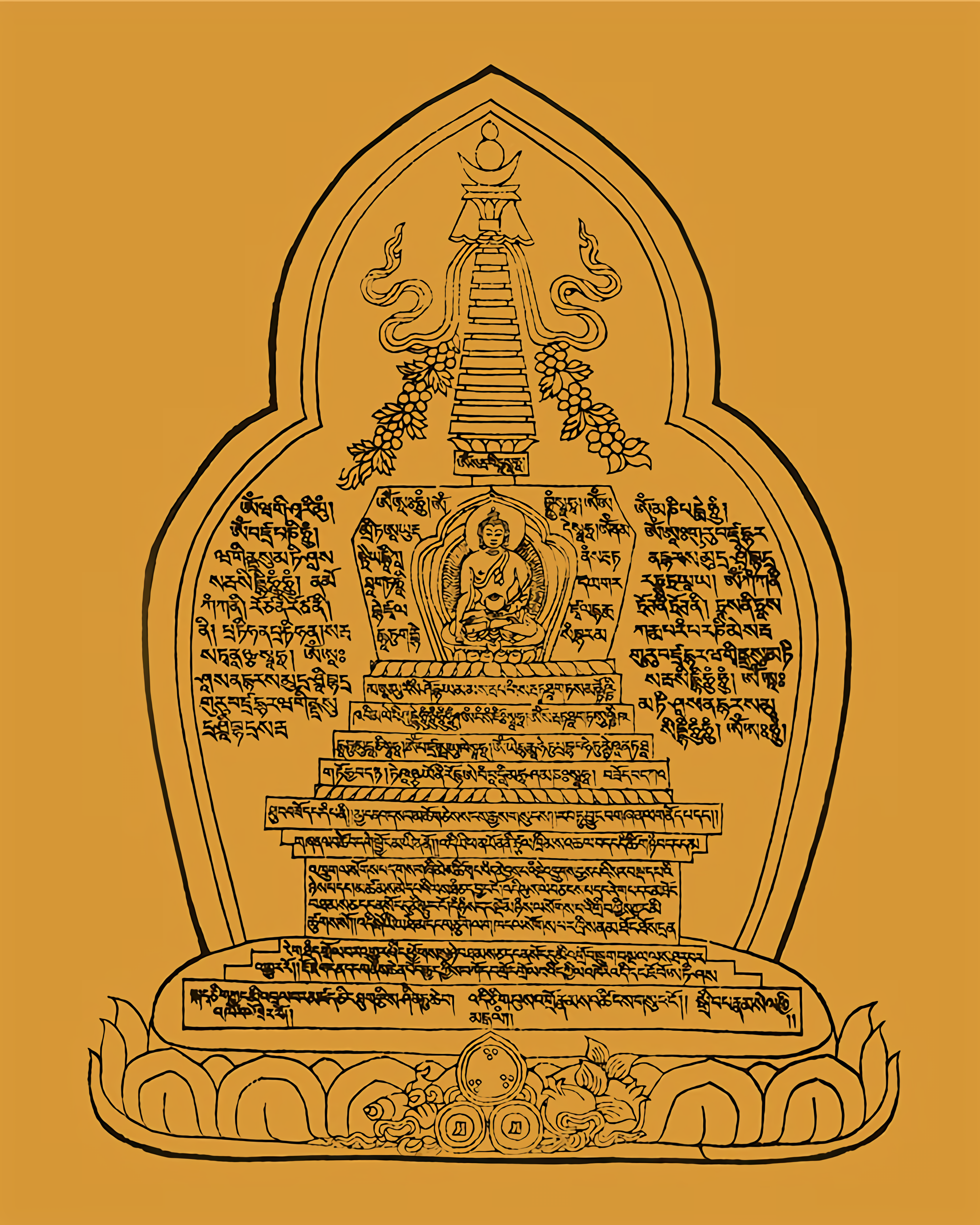 为了饶益有情,而追求解脱和究竟觉悟的佛子们,取得这一份附有真言的佛塔图像十分重要,因为祂能赐予保护的利益,来自那烂陀寺的阿底峡尊者,而那烂陀寺曾孕育了三百位大班智达和无数圣人们。 由于破戒、毁誓或纷争等导致,以及住于不同团体间冲突之处,产生的种种过失,乃至五无间业,一切罪障皆可依此咒轮得清净。一切佩戴、接触或眼见此咒轮的众生,都能免堕恶趣,也不会受到破誓言和破戒等晦气的染污。