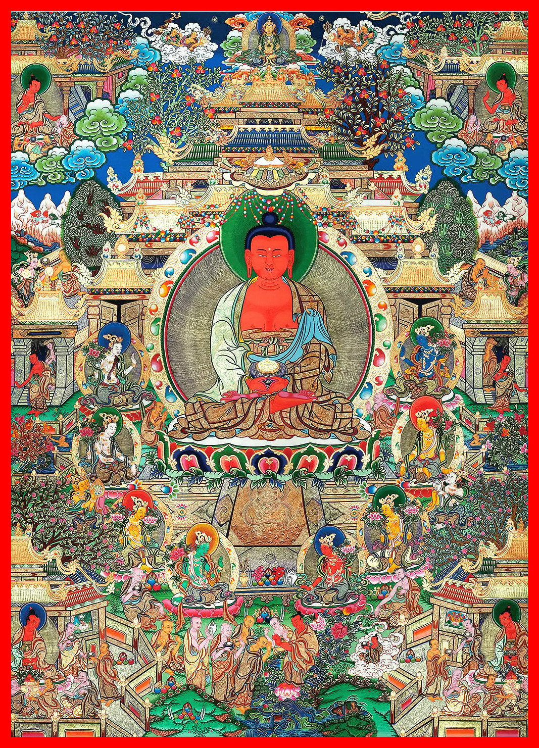 唐卡简介:中心位置为极乐世界教主无量光佛(阿弥陀佛),结跏趺坐,手中持钵,钵内盈满无死甘露。身边围绕观音、势至、文殊、普贤、地藏、弥勒、虚空藏、除盖障八大眷属菩萨等。