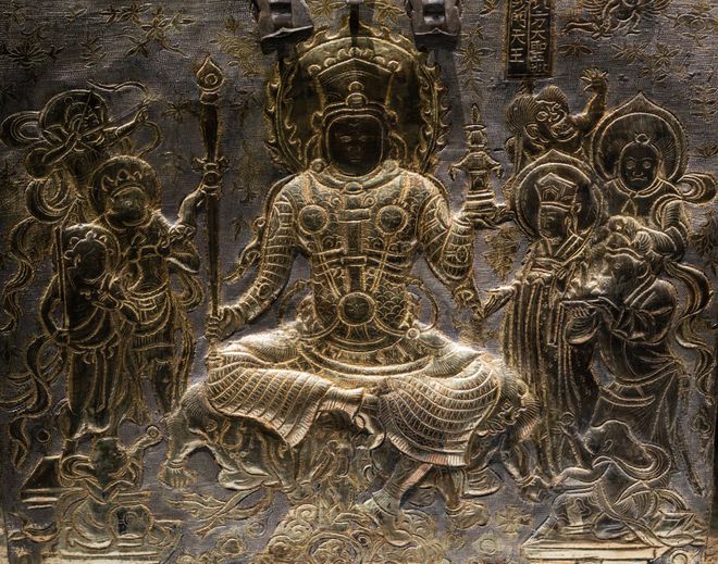 此件宝函是盛放第一枚佛指舍利——玉质影骨的八重宝函的第2重。通体鎏金,函体顶部錾刻双龙捧如意宝珠,四侧錾佛教四天王像,四天王均有手持不同兵器的眷属众部围绕,极其威严。四天王在此不仅寓意护持佛法,更有保护佛指舍利之意。