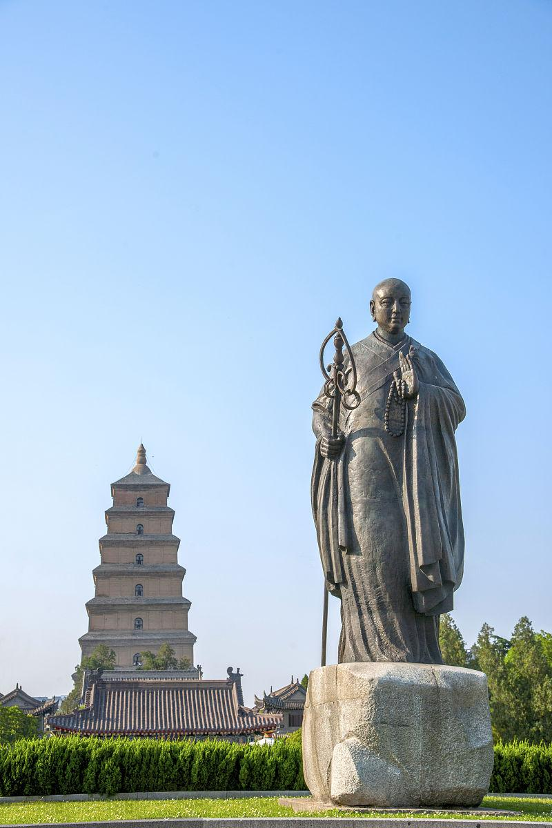 玄奘法师铜像位于大雁塔南广场上,是南广场的标志性建筑。如果从正门前往大雁塔,那么首先要经过的便是玄奘法师铜像,在这个位置,可以将法师的风姿和身后的大雁塔一览无余,蓝天下显得格外大气。