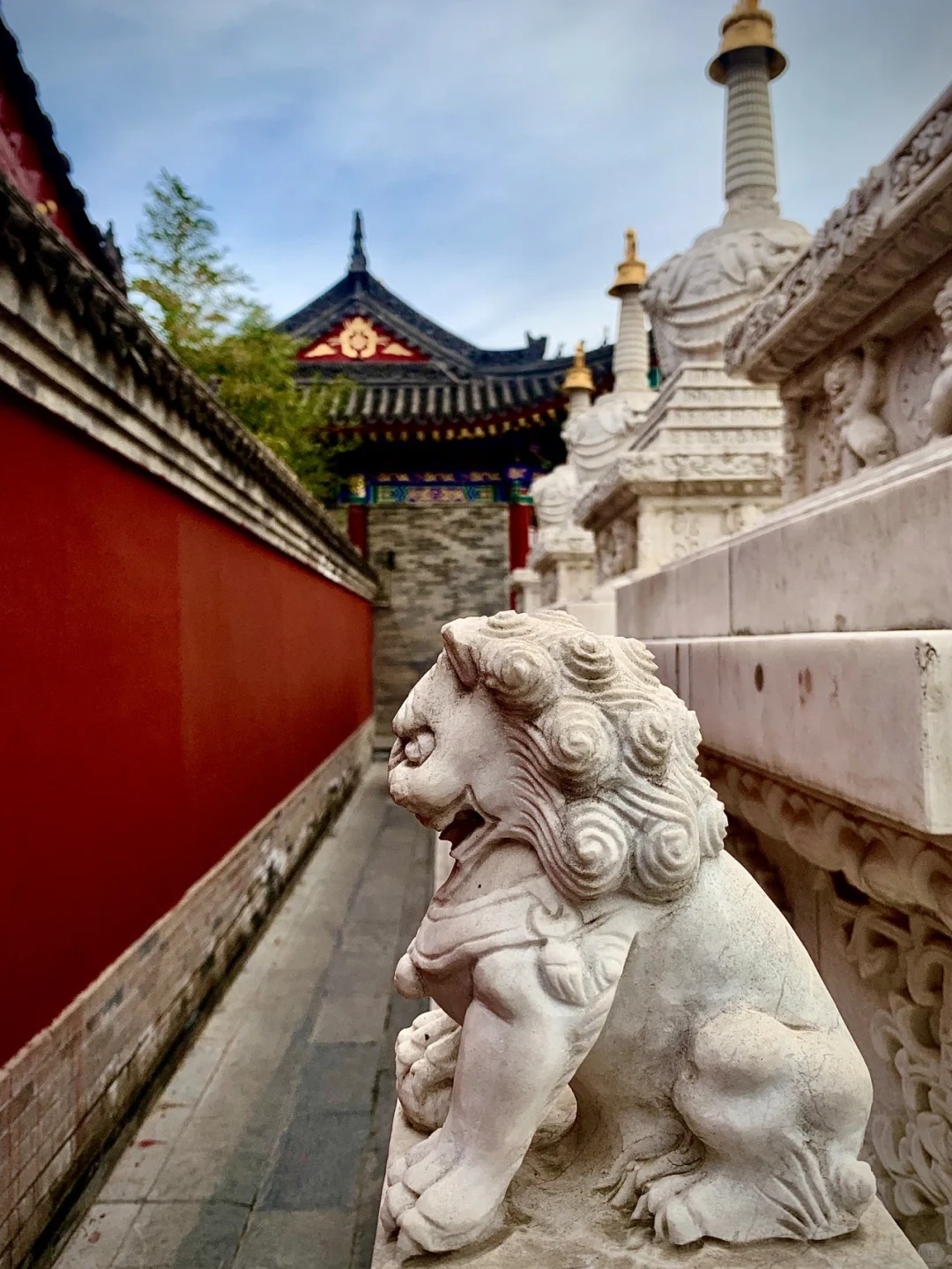 广仁寺山门外两侧矗立有整齐成一线的八座如来宝塔,以赞颂释迦牟尼一生八大功德。八塔建于2008年,风格迥异,包含不同含义,采用上等汉白玉,雕刻手法精细,总高4.6米。站在广仁寺前的广场,蓝、白、红、黄彩色的风幡在蓝天之下迎风飘展,仿佛置身在西藏的雪域高原。