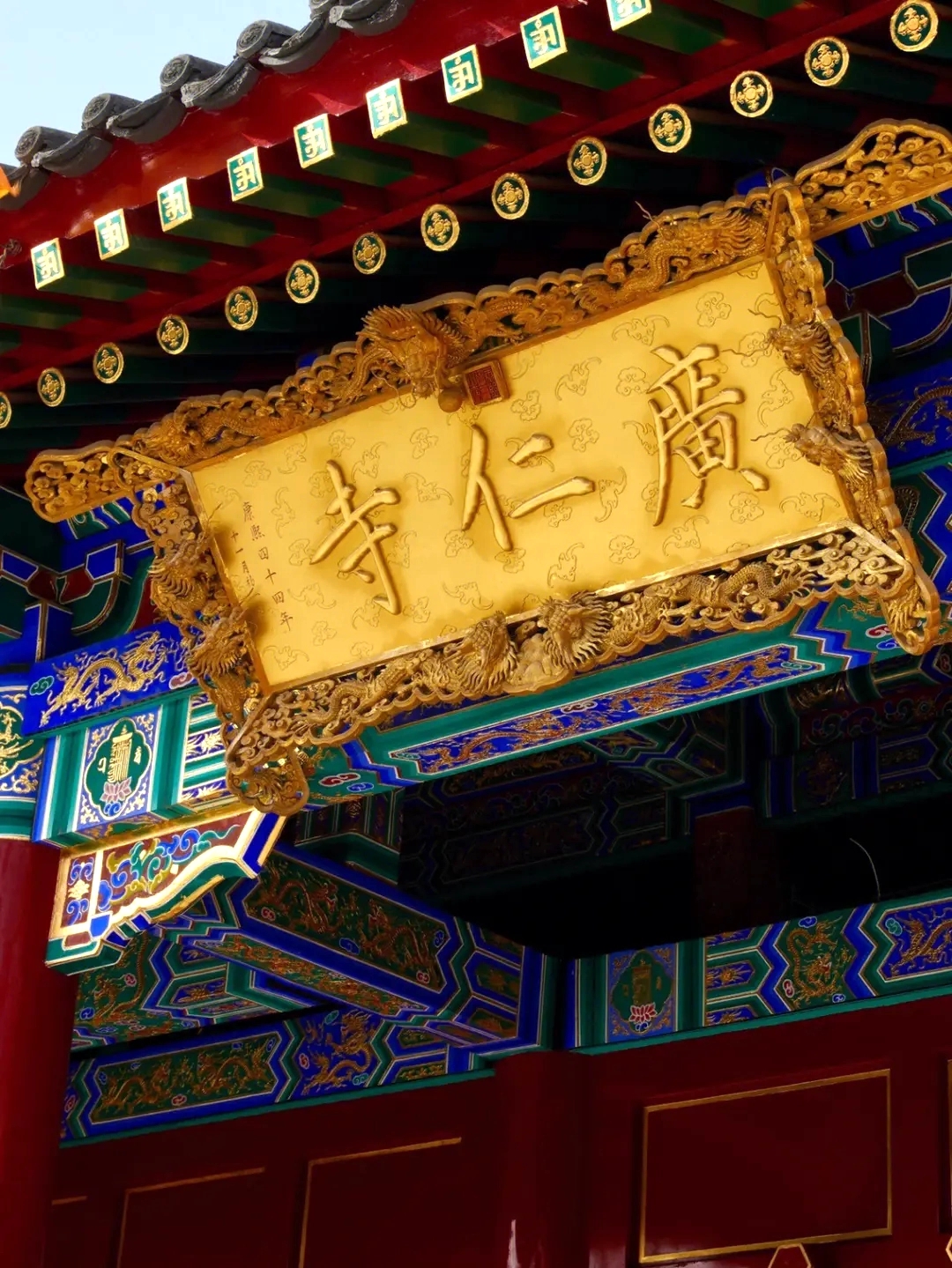 广仁寺的山门:入寺山门上的门匾,上书《广仁寺》,山门为康熙皇帝御匾。印章刻有“康熙皇帝御笔之宝”八字。原匾已毁失,今匾为复制品。门顶上是双鹿法轮图案。中间是轮宝,旁边有两只鹿,表示佛陀在鹿野苑初转法轮。法轮象征着佛、法、僧三宝,驯服的双鹿喻指信徒大众,是藏传佛教的又一重要标志。
